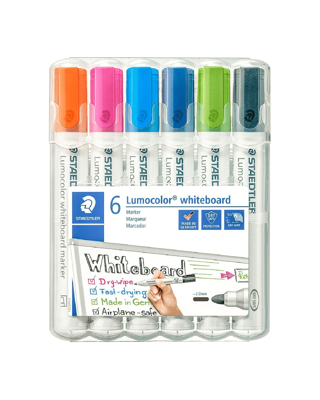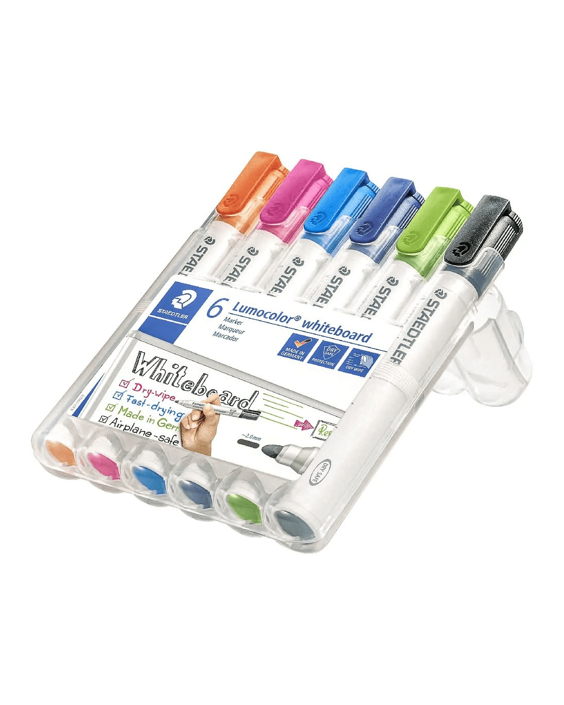 These Staedtler Lumocolour Whiteboard Markers are a great option for marking a variety of dry erase surfaces, including whiteboards, glass and porcelain. The markers feature dry safe ink which allows you to leave the cap off for days before they dry out. This pack comes with 6 bright coloured markers.