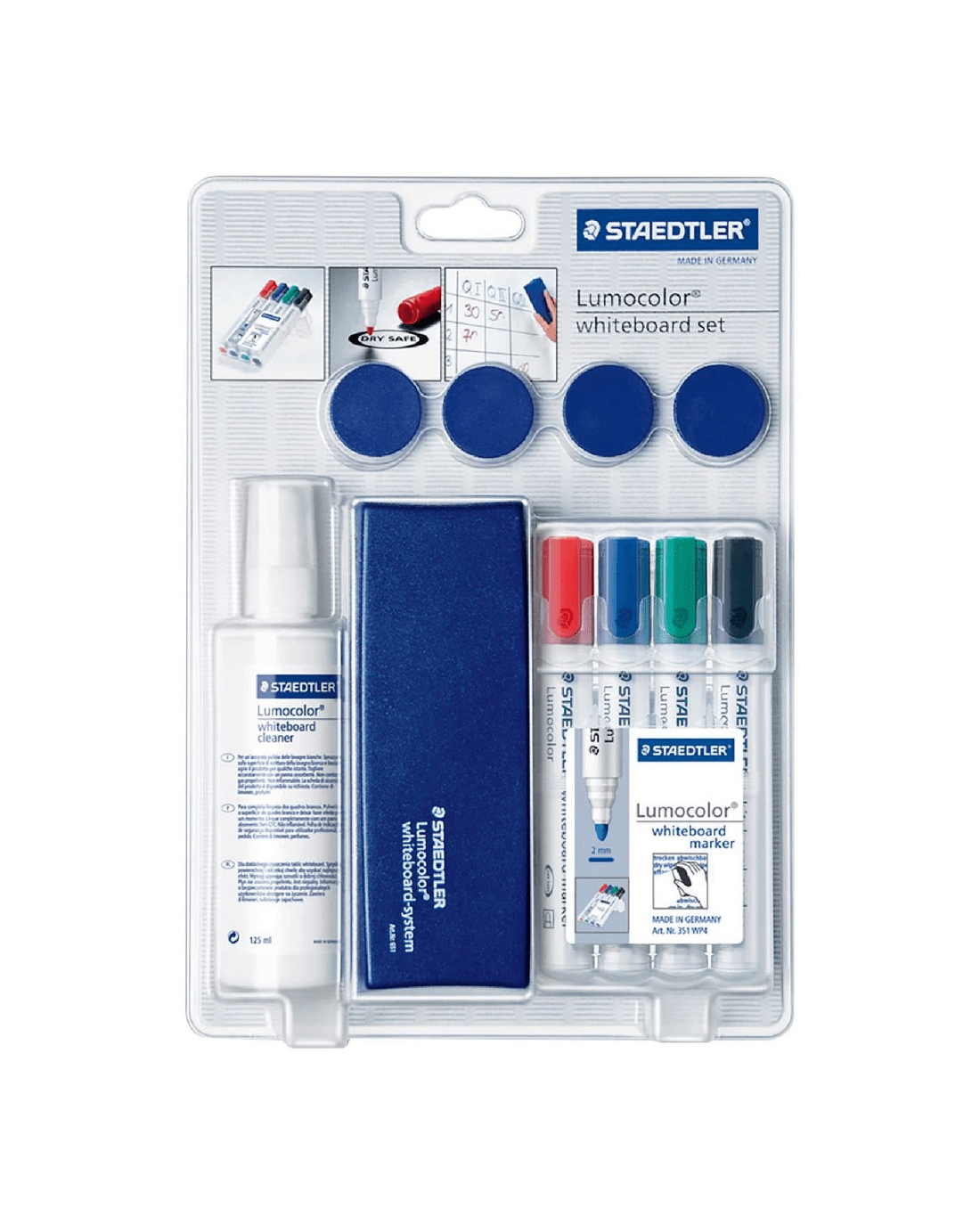 This Staedtler Lumocolor Whiteboard Set includes a marker wallet, 4 markers, a wiper, cleaning spray and 4 magnets so you'll have all your essential whiteboard accessories. The markers are quick drying and can be dry-erased from your whiteboard using the included cleaning items.