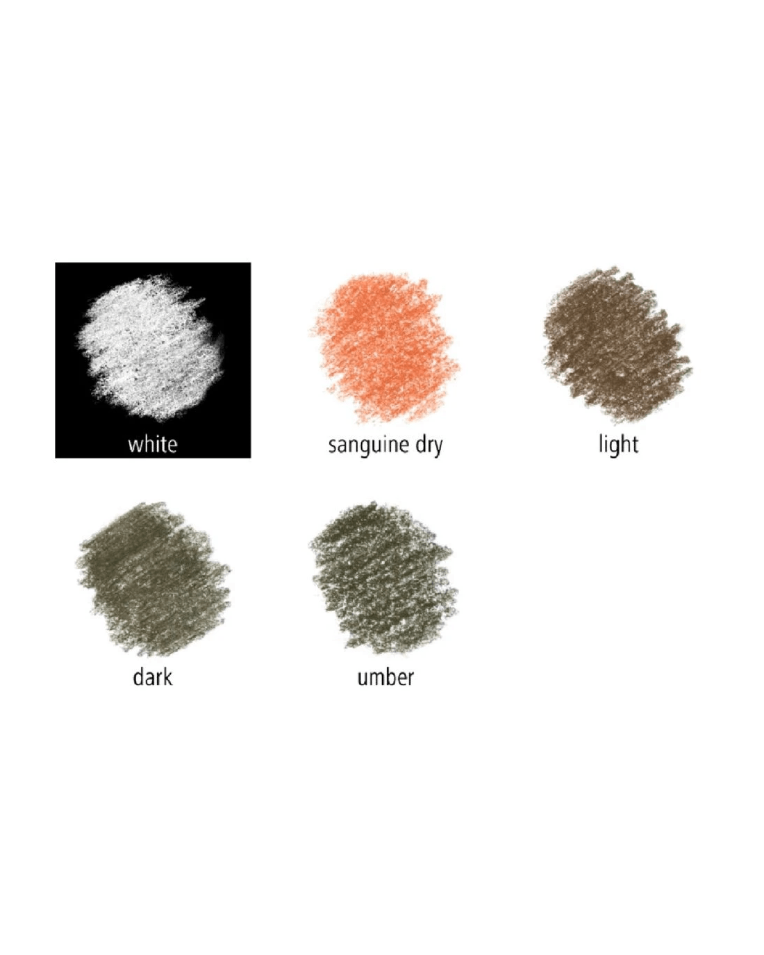 - The colours included in this pack are sepia light, sepia dark, umber, sanguine dry, white and a lighting pencil.