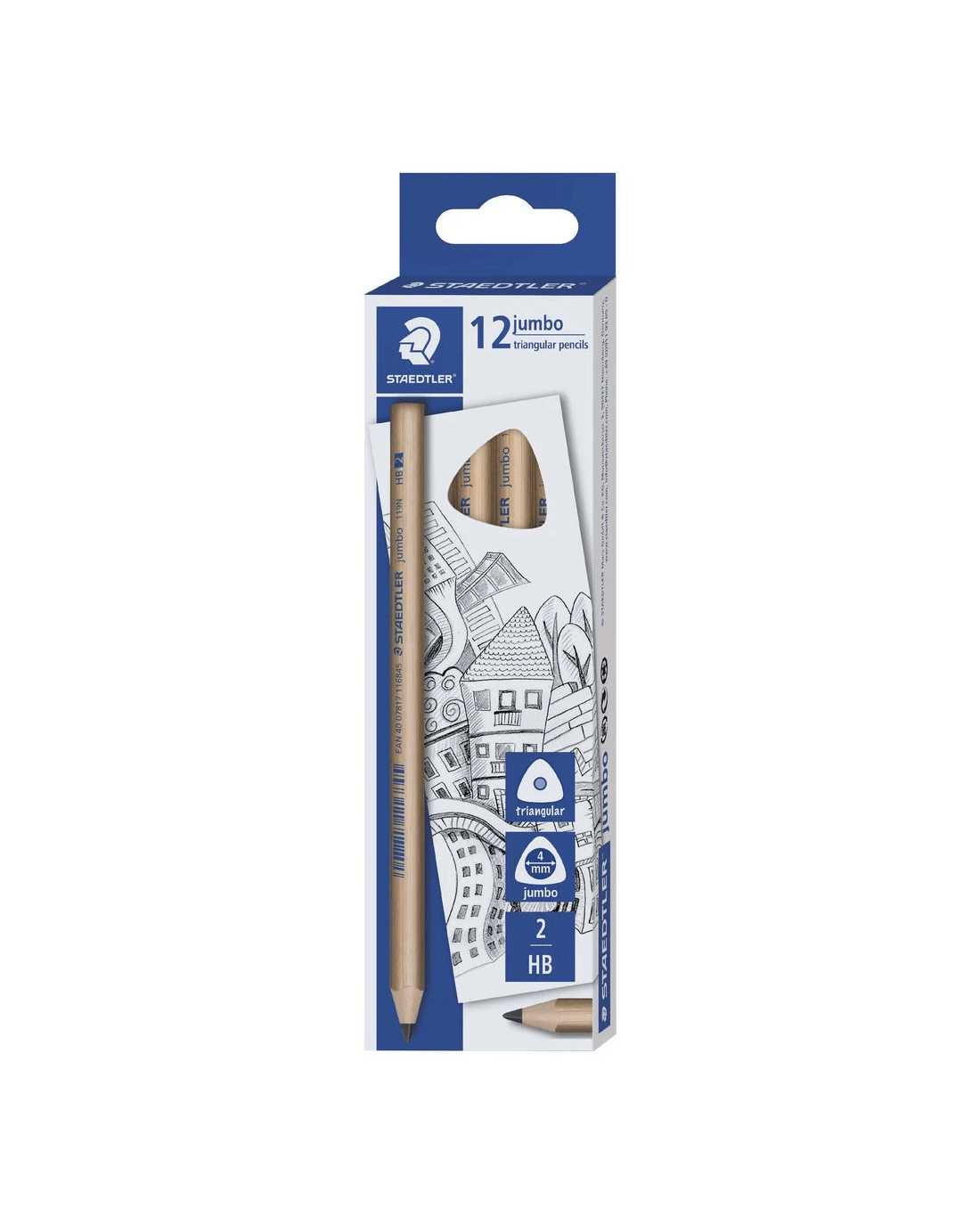 This Staedtler Triangular Pencil contains graphite lead ideal for writing, drawing and sketching applications. It's large in size making it ideal for small hands while also promoting correct grip and use. The HB lead is easy to sharpen and can be removed easily using an eraser.