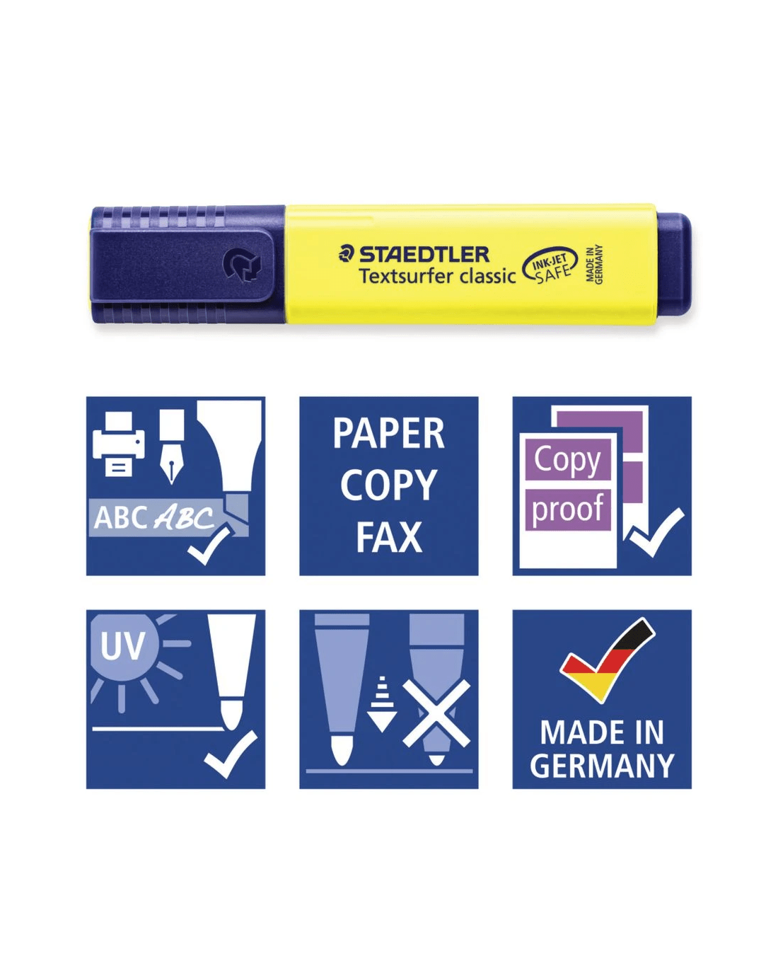 These Staedtler Textsurfer Highlighters are great for highlighting important text, drawings and more. The ink is fast drying so it won't smudge on your pages and is encased in a polypropylene barrel to prevent the ink inside from drying out.