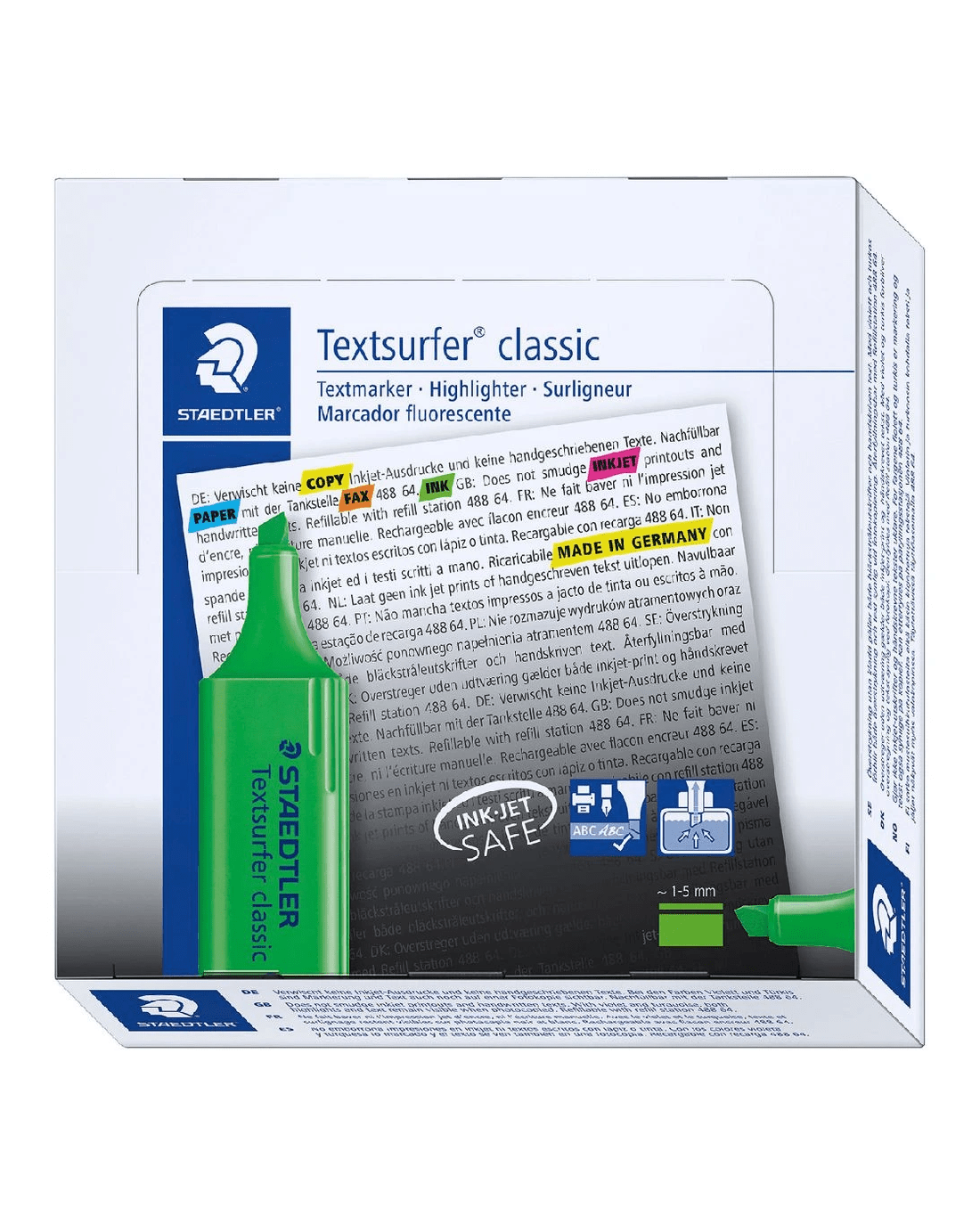 The Staedtler Textsurfer is a super fluorescent highlighter for paper, copy and fax that will make text stand out from the page. The highlighter is inkjet safe so you don't have to worry about smudging inkjet printouts and hand written text.