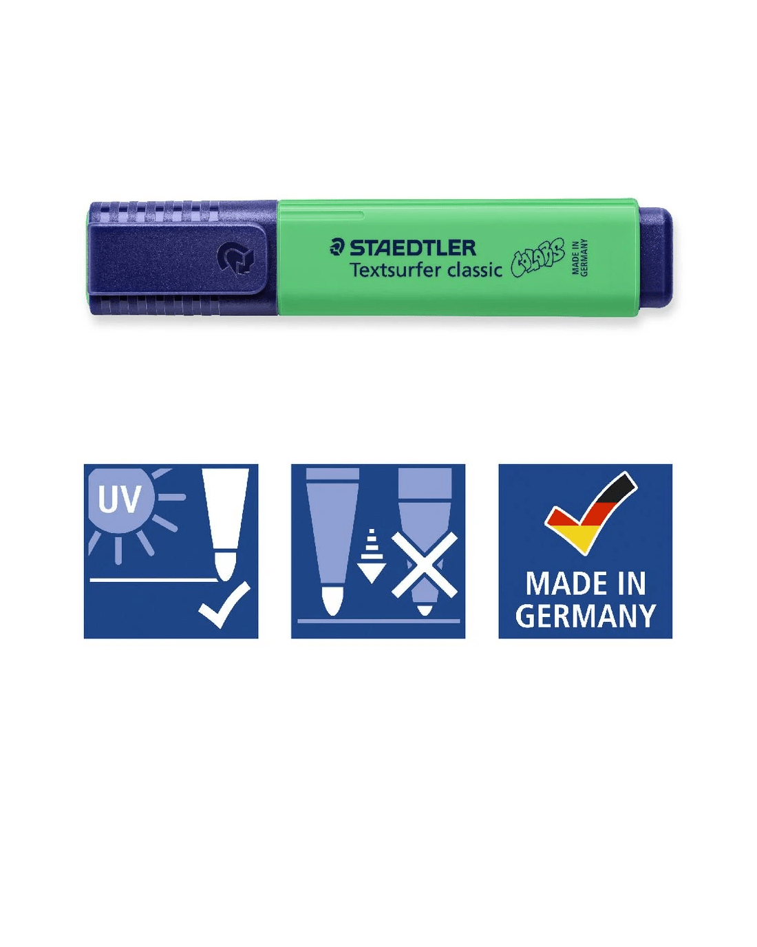 Colour large areas of your notebook with the Staedtler Textsurfer Highlighter, a great companion for marking texts and emphasising important information. It has a large ink reservoir for long-lasting performance, and a fast-drying formula so stays on your page without interruption. It's airplane-safe to prevent it from leaking on a flight, and has an easy twist cap for securing the tip on the go.