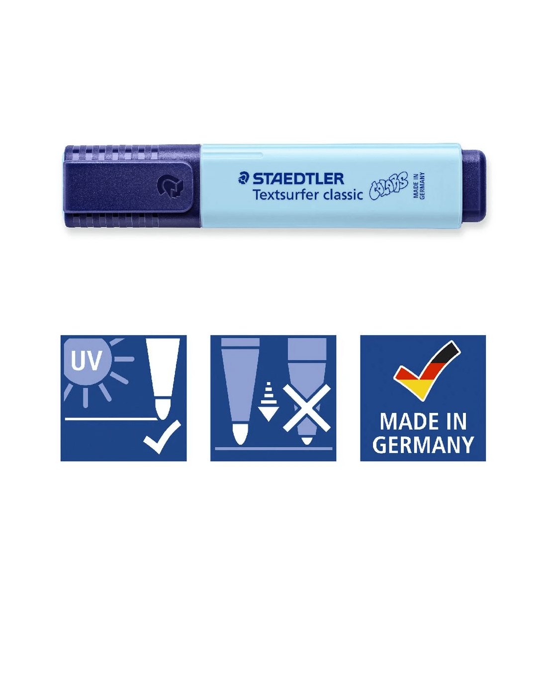 Colour large areas of your notebook with the Staedtler Textsurfer Highlighter, a great companion for marking texts and emphasising important information. It has a large ink reservoir for long-lasting performance, and a fast-drying formula so stays on your page without interruption. It's airplane-safe to prevent it from leaking on a flight, and has an easy twist cap for securing the tip on the go.