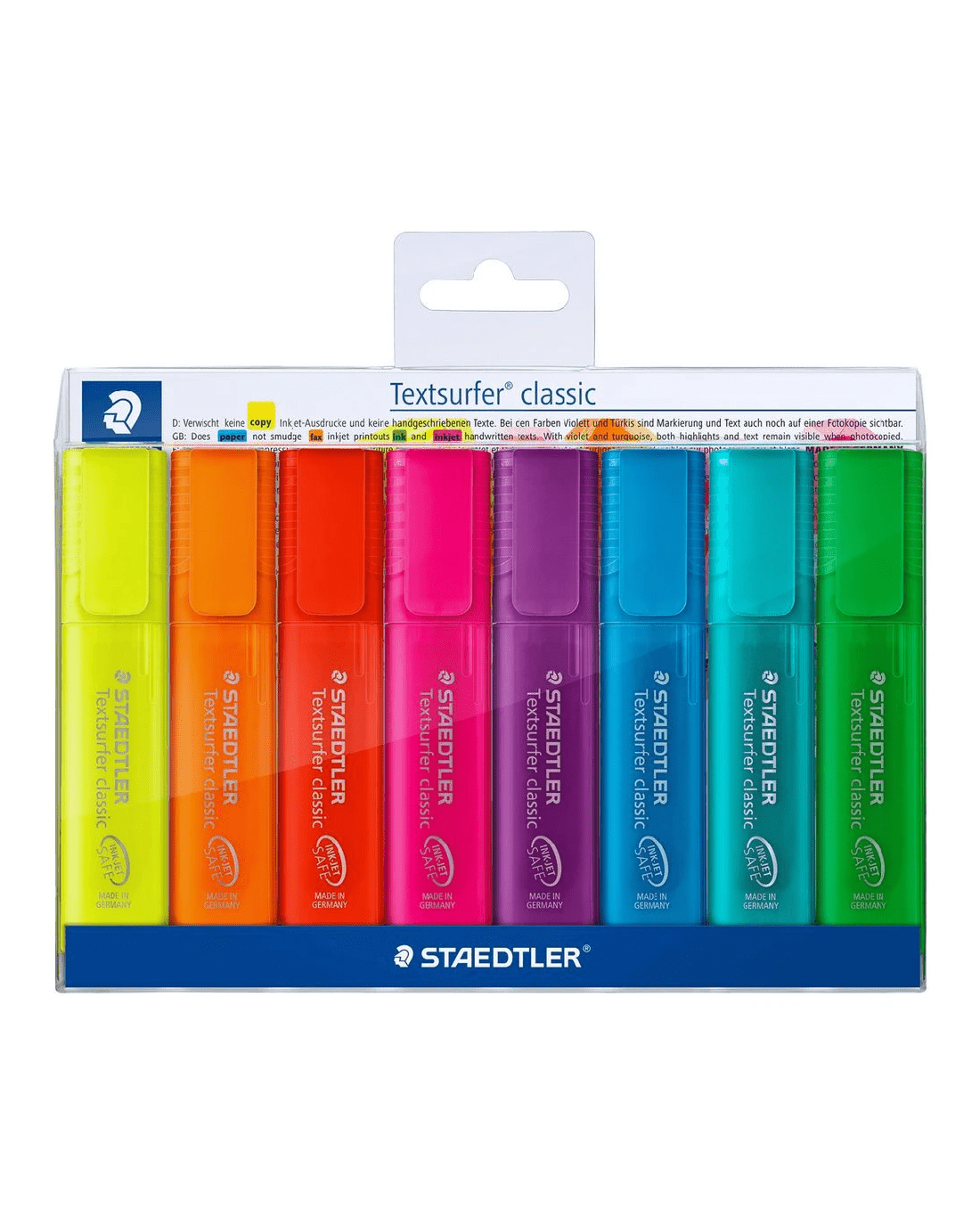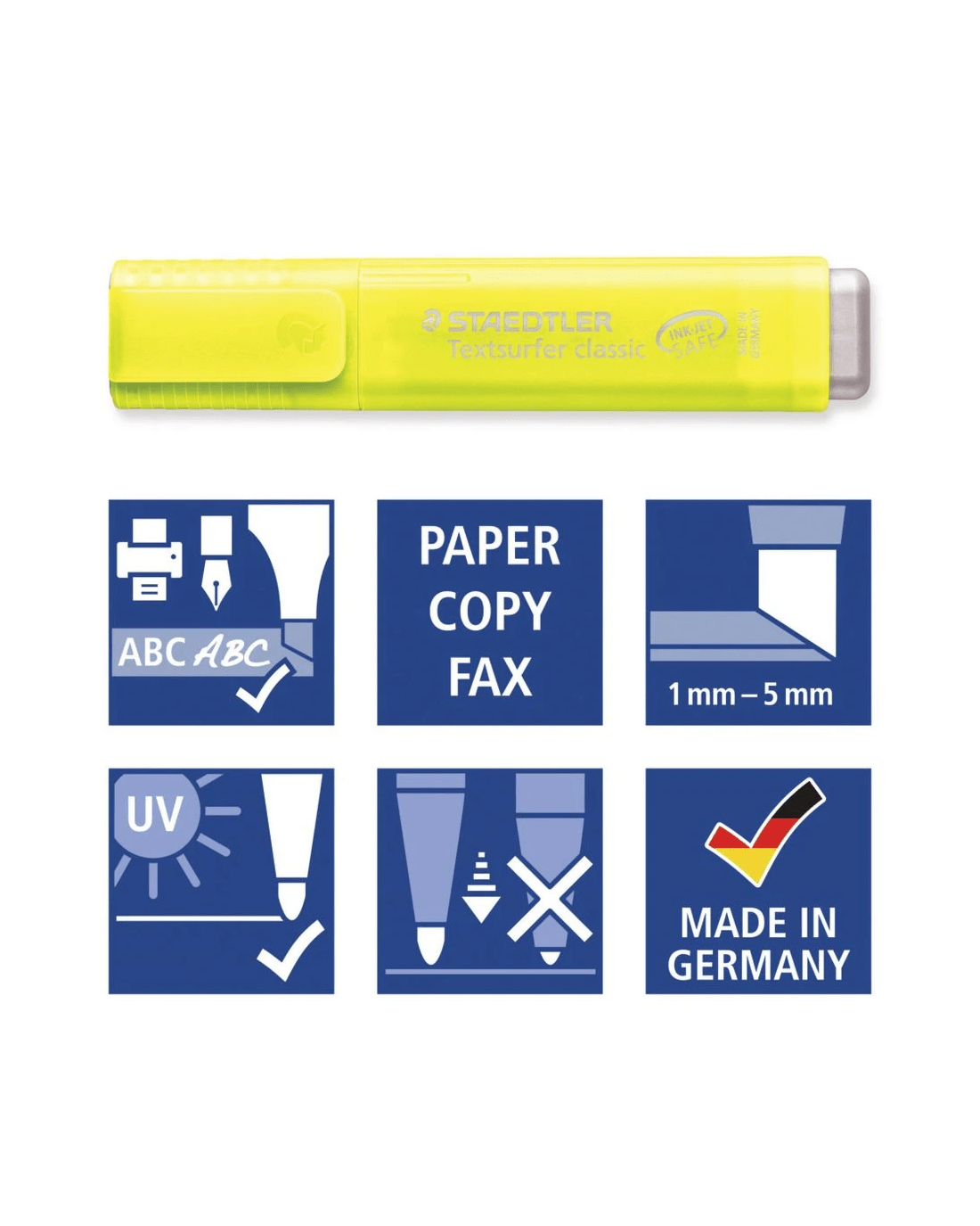 These Staedtler Textsurfer Classic Highlighters are perfect for drawing attention to information on paper, copy and faxes. They have a strong, pigmented ink with a soft chisel nib which makes using the highlighters simple and easy. These highlighters can be used over inkjet prints, ink and lead pencil without smudging.