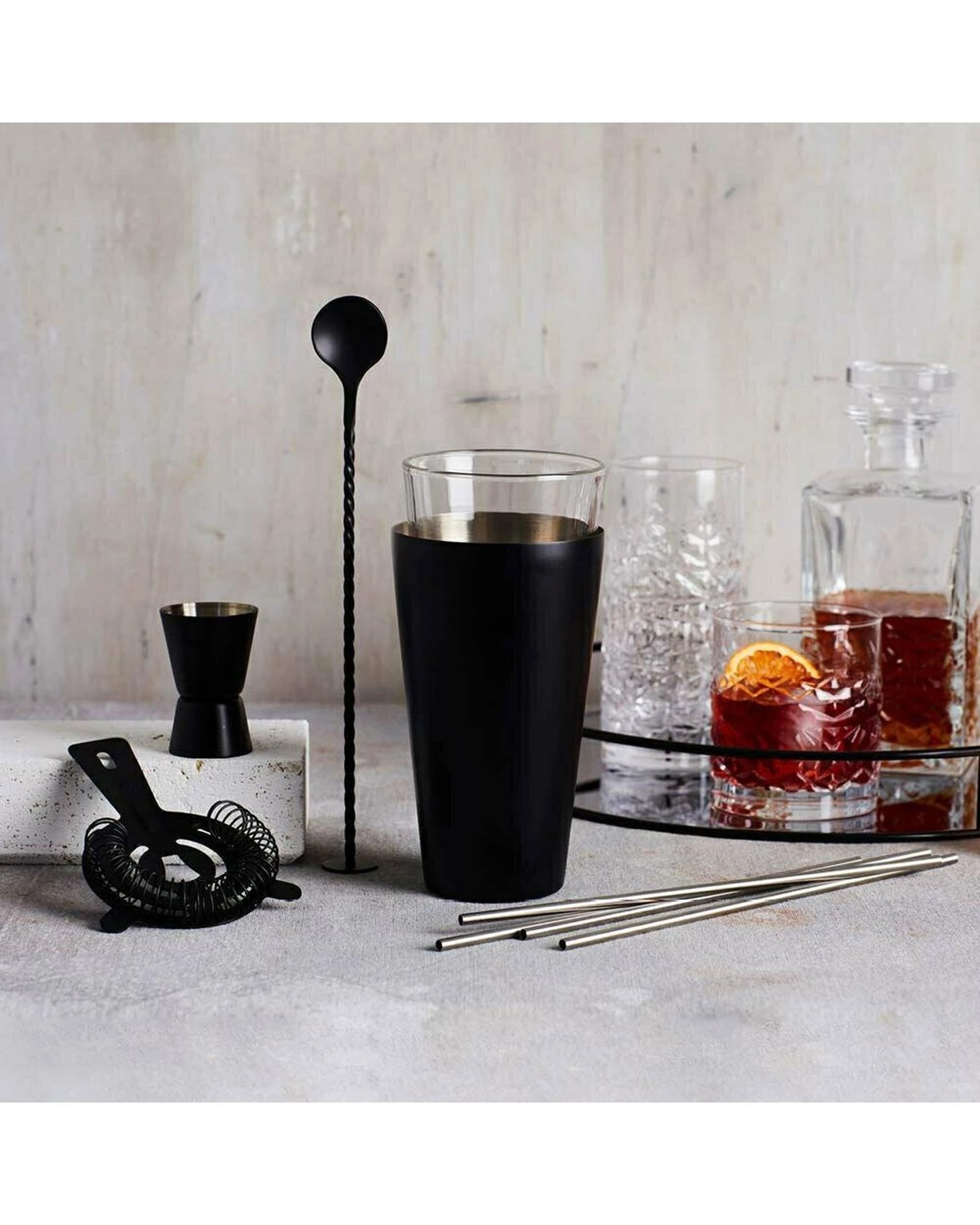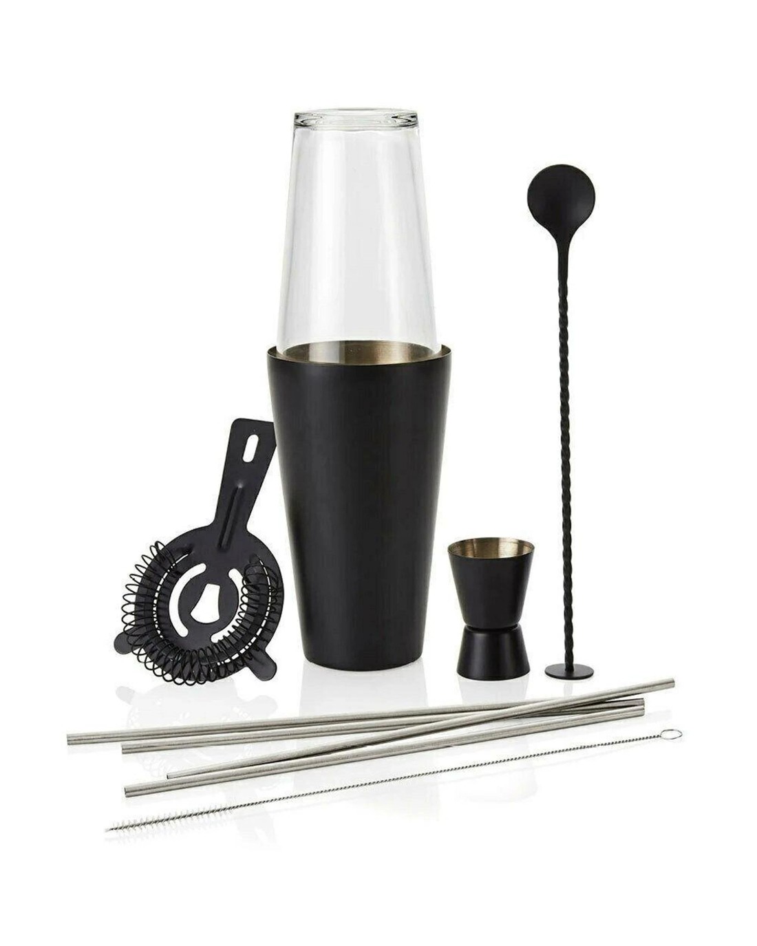 • Colour: Jigger, shaker, strainer & stirrer: matte black; straws: stainless steel