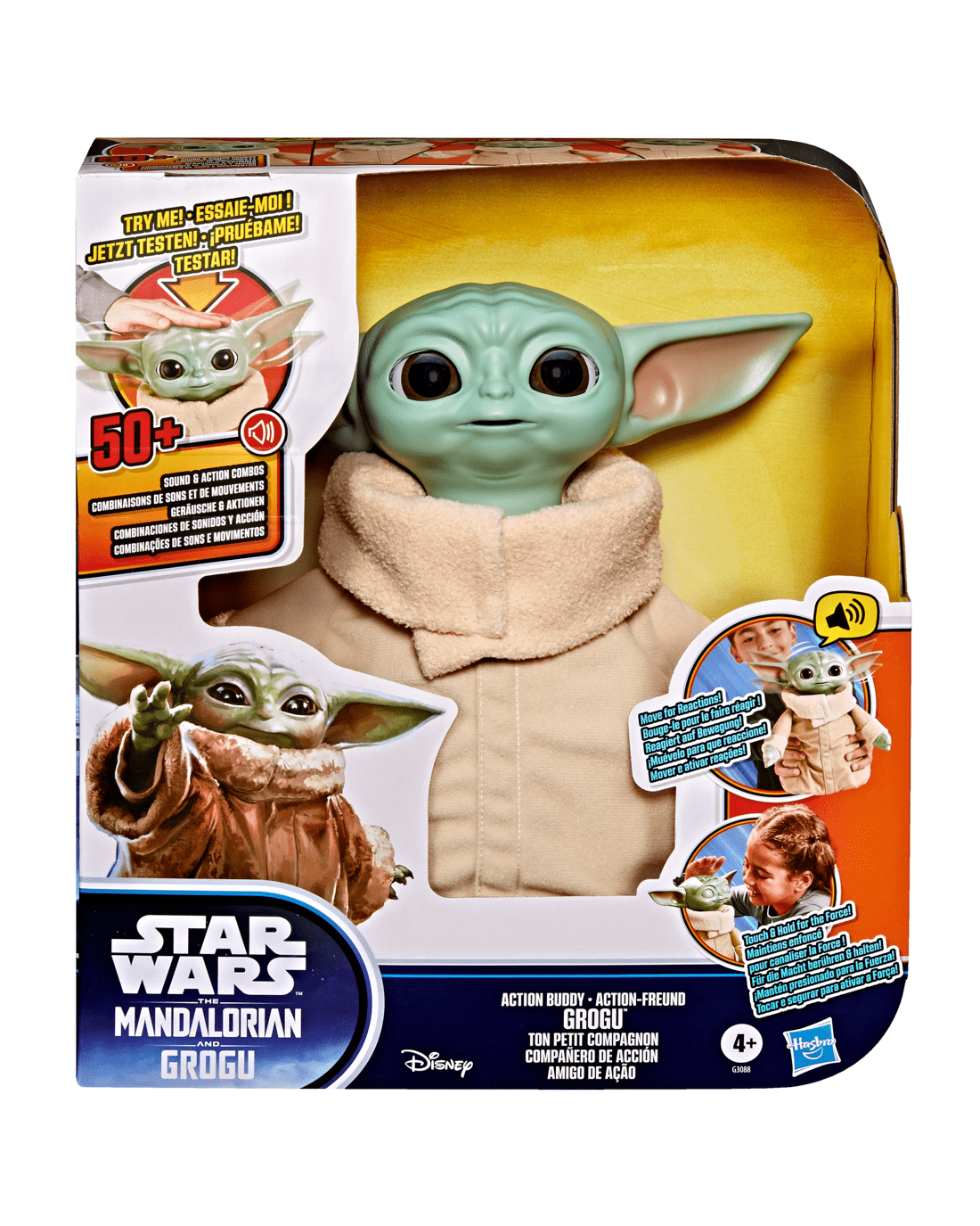 Epic adventures await with the Star Wars Action Buddy Grogu figure, an interactive toy for kids and fans alike! Featuring 50+ sound and movement combos, this Star Wars toy is great for action-packed adventures and out-of-this-world snuggles when it's time to rest. Press Grogu's head to activate different reactions, like moving his head, closing his eyes, and of course, making adorable sounds. This 10-inch (25cm) Star Wars plush animatronic features a soft body, so kids can give Grogu love and cuddles after a day of on-the-go play. Plus, he's ready to go right out of the box with 3 AA batteries included. Look for even more Grogu and Mandalorian movie toys to give as gifts for Star Wars fans ages 4+. (Each sold separately. Subject to availability.)