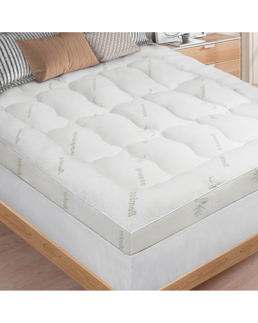 Our mattress topper is filled with eco-friendly bamboo microfibre filling and brings comfort without odours and allergens. Plus, the naturally breathable and moisture-wicking cover is hypoallergenic. It's easy to enhance your comfort or upgrade the experience of an old mattress with our topper. The 45cm fitted skirt keeps the topper firmly in place and smoothly attached to your mattress despite tossing and turning through the night, decreasing a tangled mess in the morning.