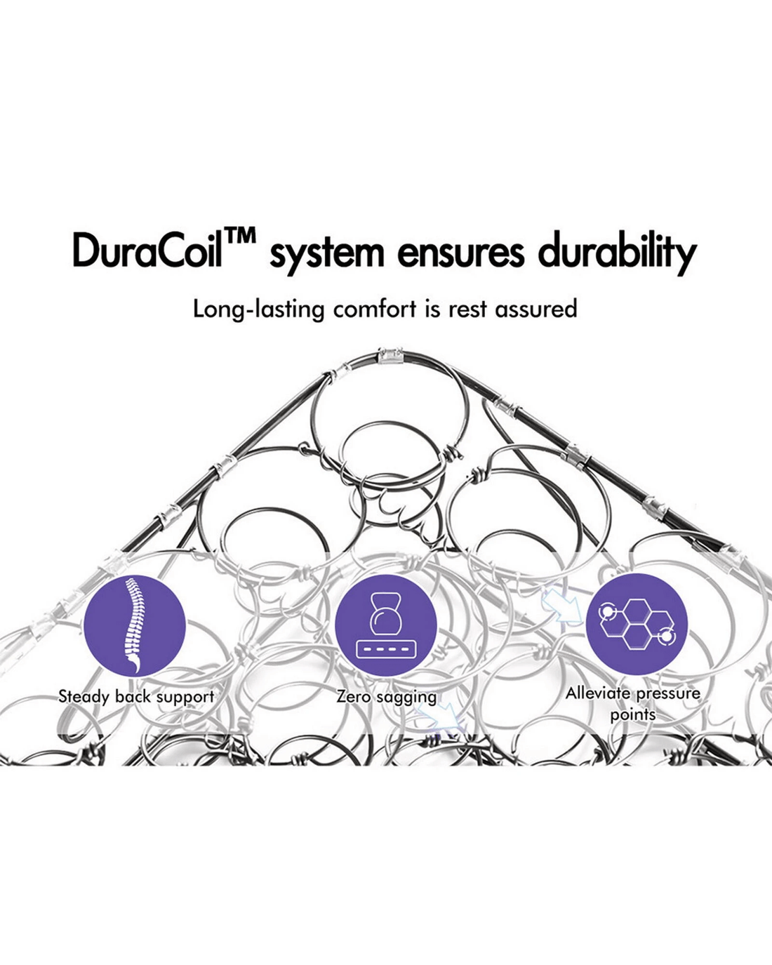 Aside from being comfortable, our DuraCoil bonnell spring system inside the mattress is steady and supportive. Being an interconnected mesh of spring coils, the bonnell spring system gives consistent support throughout the bed surface. This spring system particularly helps elevate & align the spine and surrounding muscles together, providing a steady support to the back. In the meantime, The innerspring coils wound together support each other and prevent sagging. The surface stays flat despite any amount of pressure and this helps prevent sagging and deterioration of the internal springs and layers of foam.