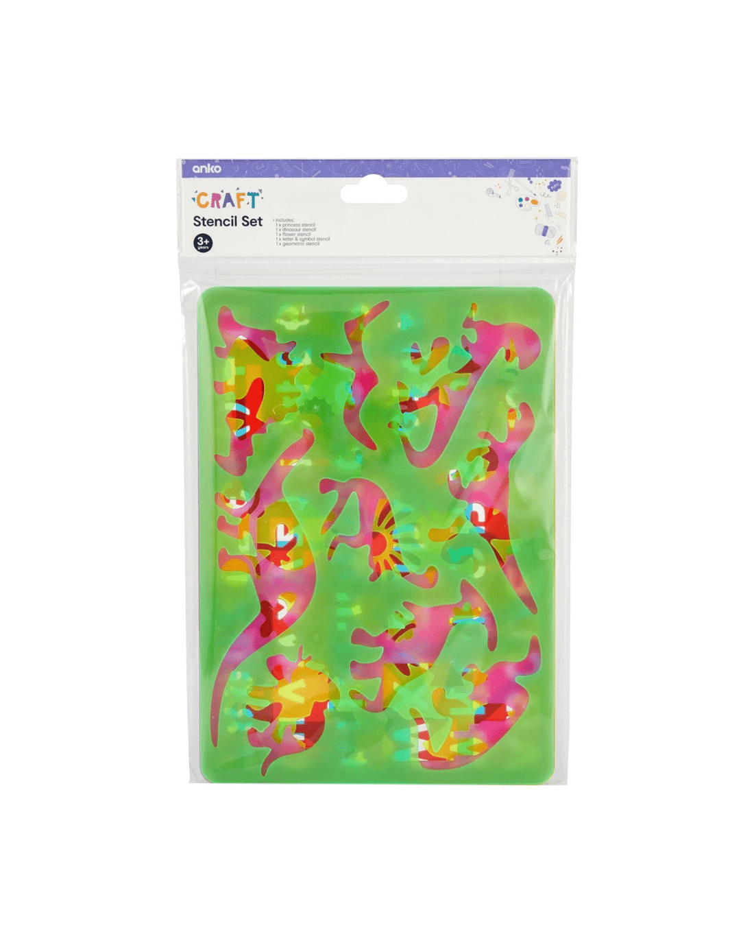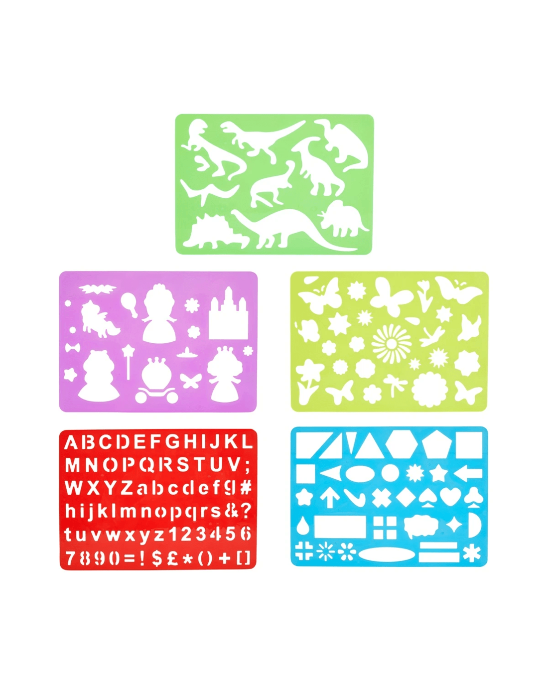 - Includes 1 x princess stencil, 1 x dinosaur stencil, 1 x flower stencil, 1 x letter and symbol stencil and 1 x geometric stencil