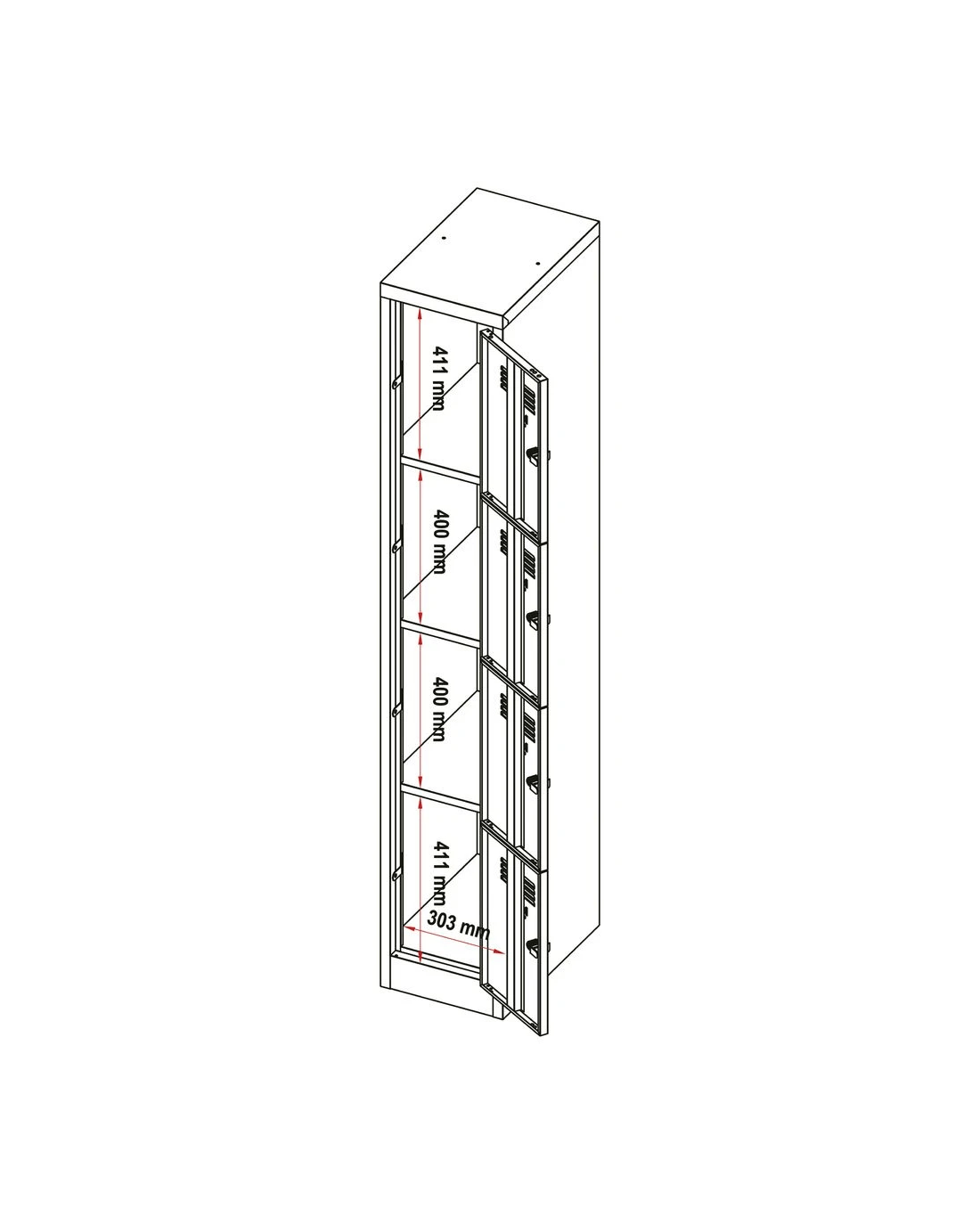 - The top locker measures 234 W x 432 D x 393 H mm.