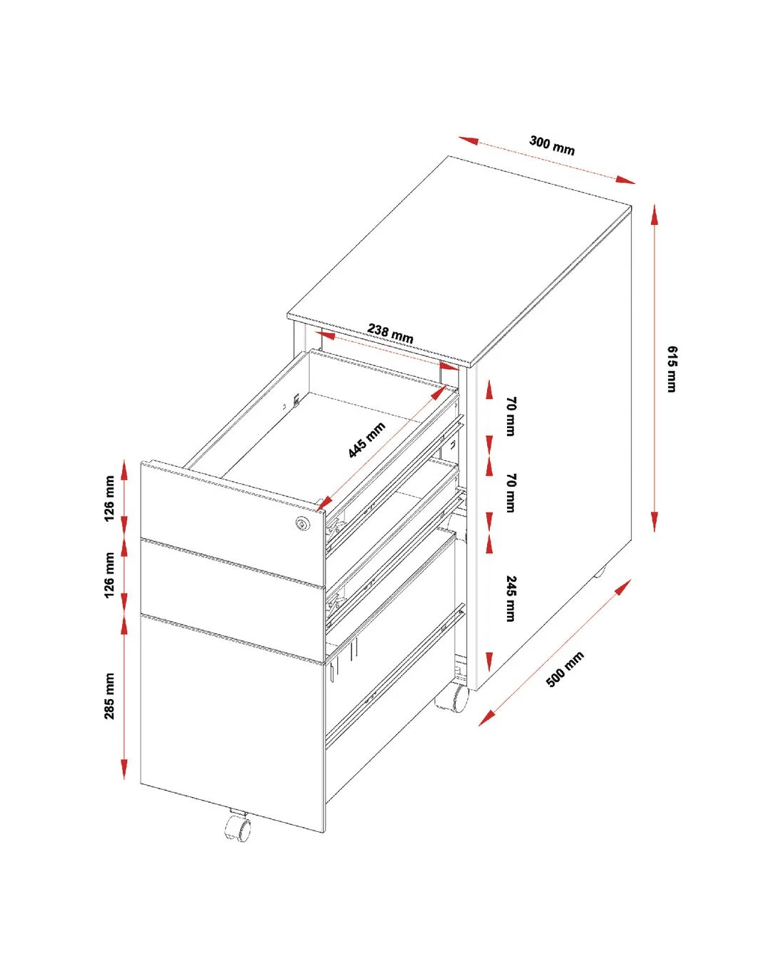 - Without castors, the pedestal measures 565 mm in height.