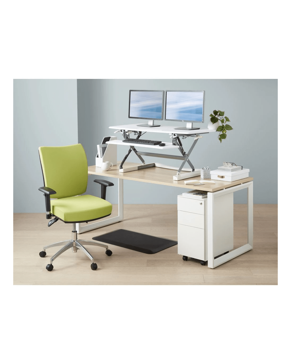 • It has a business grade construction with a powder coated steel frame and FSC certified E0 particle board top with a scratch-resistant melamine finish and 2 mm ABS edging, tested to Australian standards.