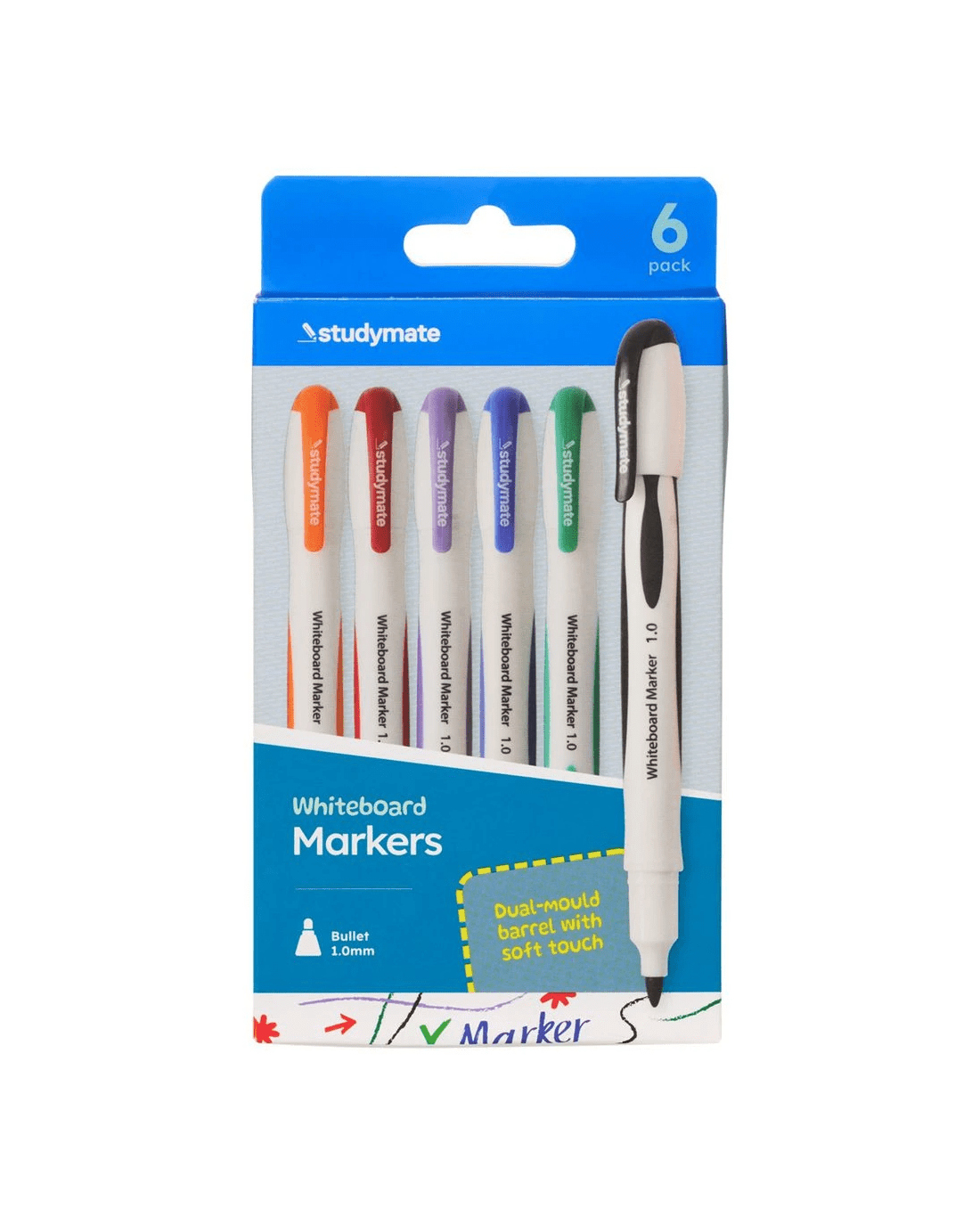 This Studymate whiteboard marker pack includes 6 assorted colours for clear, vibrant writing. Each marker features a 1.0mm bullet nib and alcohol-based ink for smooth application on whiteboards. Plus, the compact pack is ideal for classrooms, offices or home study spaces.