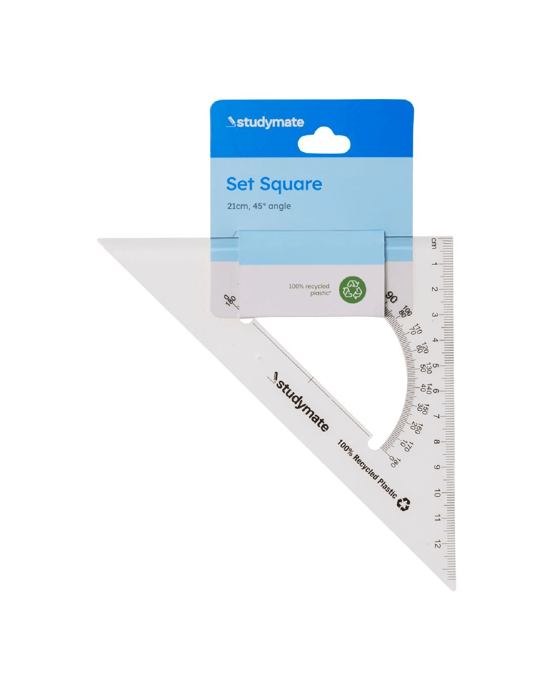 This Studymate Set Square is a must-have for all artists, designers, architects and mathematicians. Featuring a 45 degree angle, with measurements up to 21 cm in 1 cm increments, it's suitable for using with both fine, mechanical pencil lead and ink. This set square has been made from durable plastic for added peace of mind.
