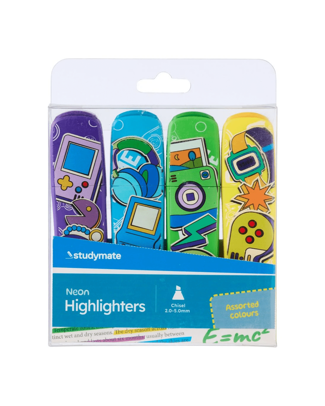This Studymate printed highlighter pack adds a fun twist to everyday highlighting with neon colours and novelty barrel designs. Each highlighter features a chisel tip and water-based ink for smooth application on paper or whiteboards. Plus, the compact PET box makes it easy to store or gift.