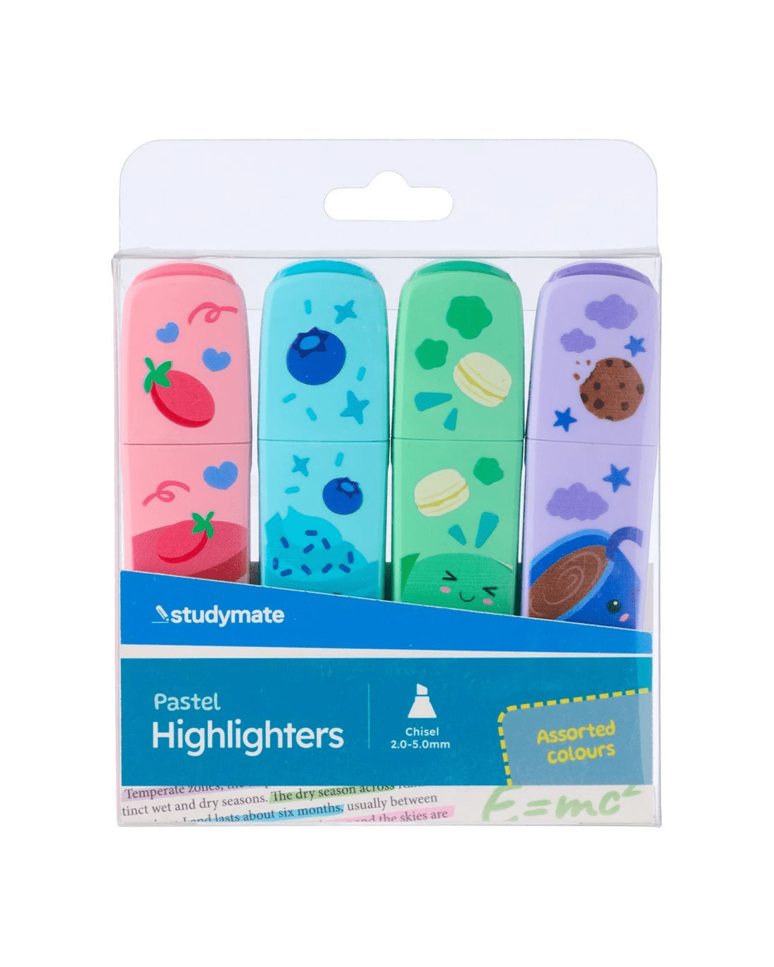 This Studymate printed highlighter pack adds a fun twist to everyday highlighting with pastel colours and novelty barrel designs. Each highlighter features a chisel tip and water-based ink for smooth application on paper or whiteboards. Plus, the compact PET box makes it easy to store or gift.