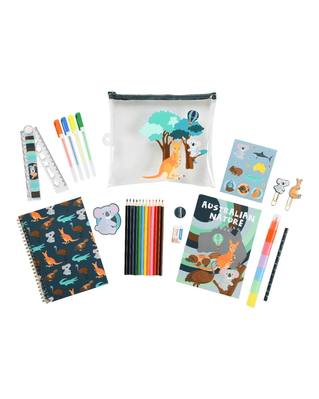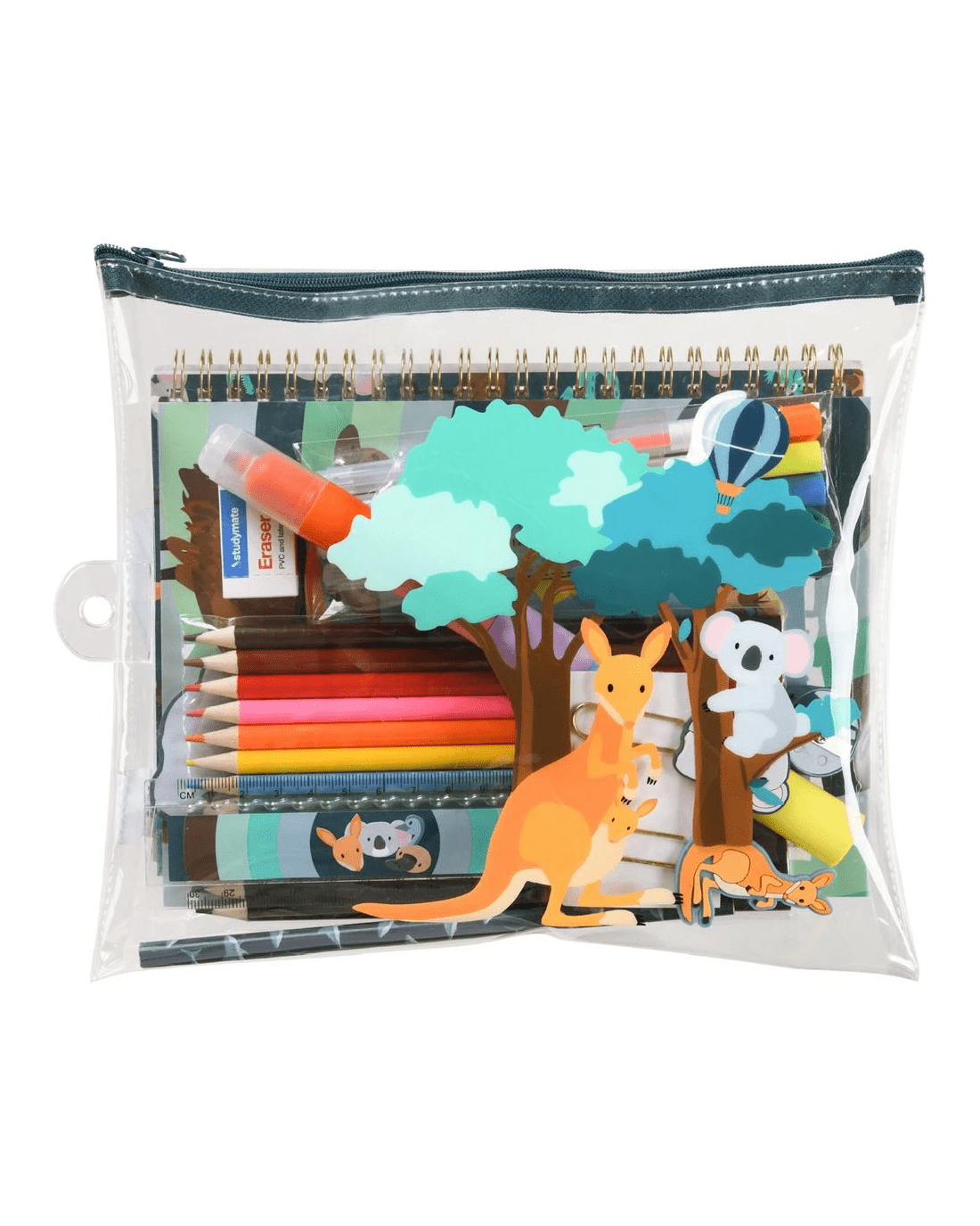 Unleash your imagination with this Studymate Pencil Case Set. Featuring an Australian-themed design, this 34 piece set includes everything you'll need to create your own outback adventure including a pencil case, coloured pencils, gel pens, coloured stacking highlighters, silicone paper clips, an A5 spiral notebook, a 30 sheet sticky notepad, a 24 page colouring book, sharpener, eraser, 30 cm foldable ruler, sticker sheet and HB pencil.