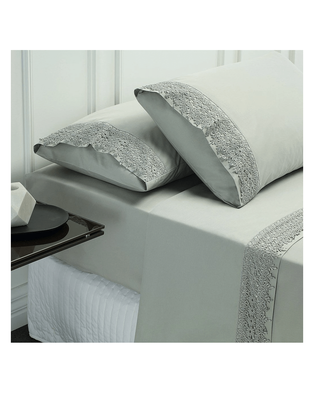 A classic, Redefined collection, the Valencia Sheet Set by Style & Co. in Silver features a distinct lace embroidered pattern and 100% combed Egyptian Cotton construction take the bed sheet to the next level. These 5-star Hotel Collection Sheet Set give comfortable sleep and enhance a classy look to your decor with the lace trim. Each of the collections' crisp linens has been crafted from 100% long staple Egyptian cotton for luxurious softness and durability. Package Includes: 1 x Flat Sheet measuring 255 x 260 Cm, 1 x Fitted Sheet measuring 152 x 203 + 50 Cm and 2 x pillow casess measuring 48 x 74 + 16 Cm Flap.