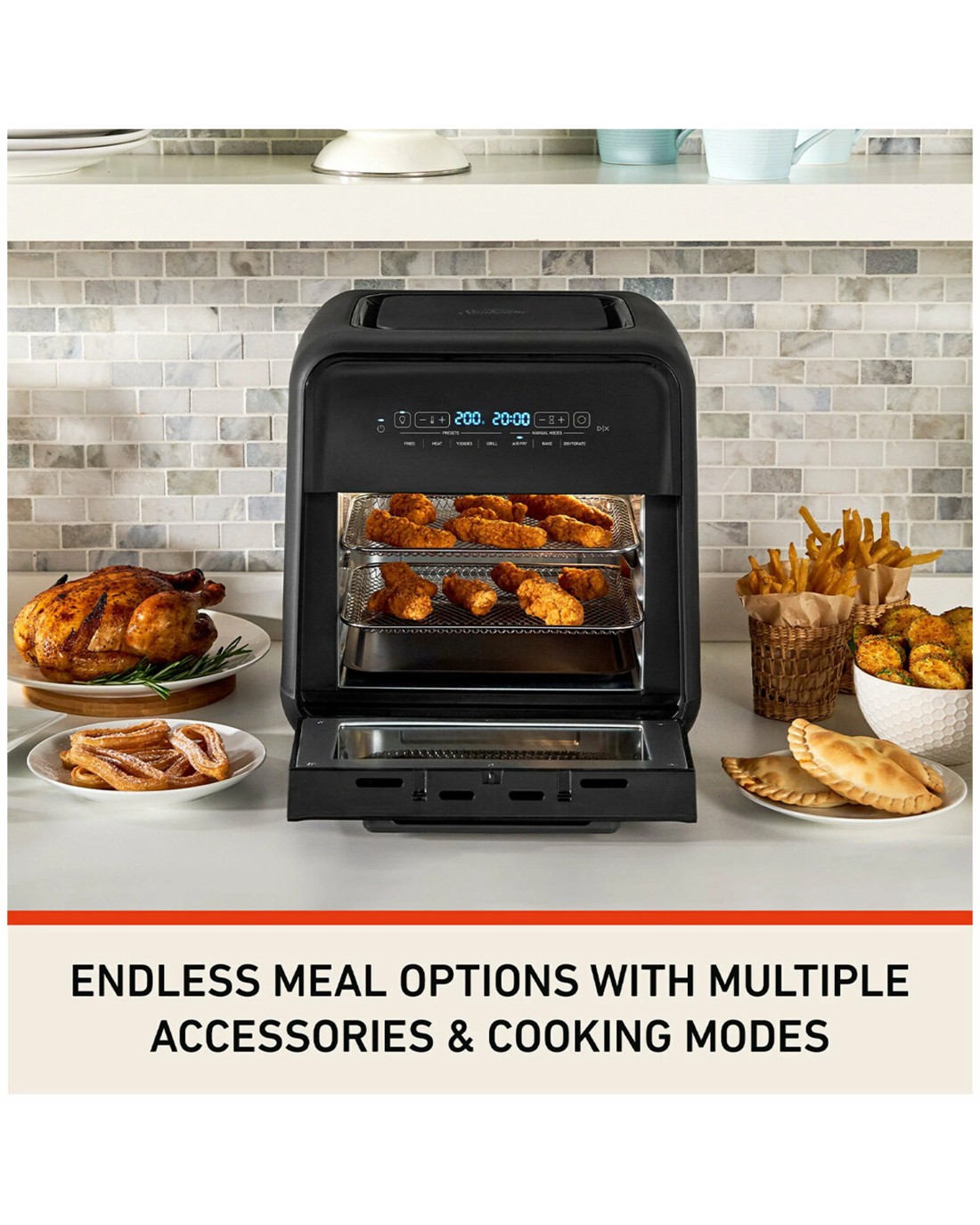 Five functions: Air fry, rotisserie, grill, bake and dehydrate.