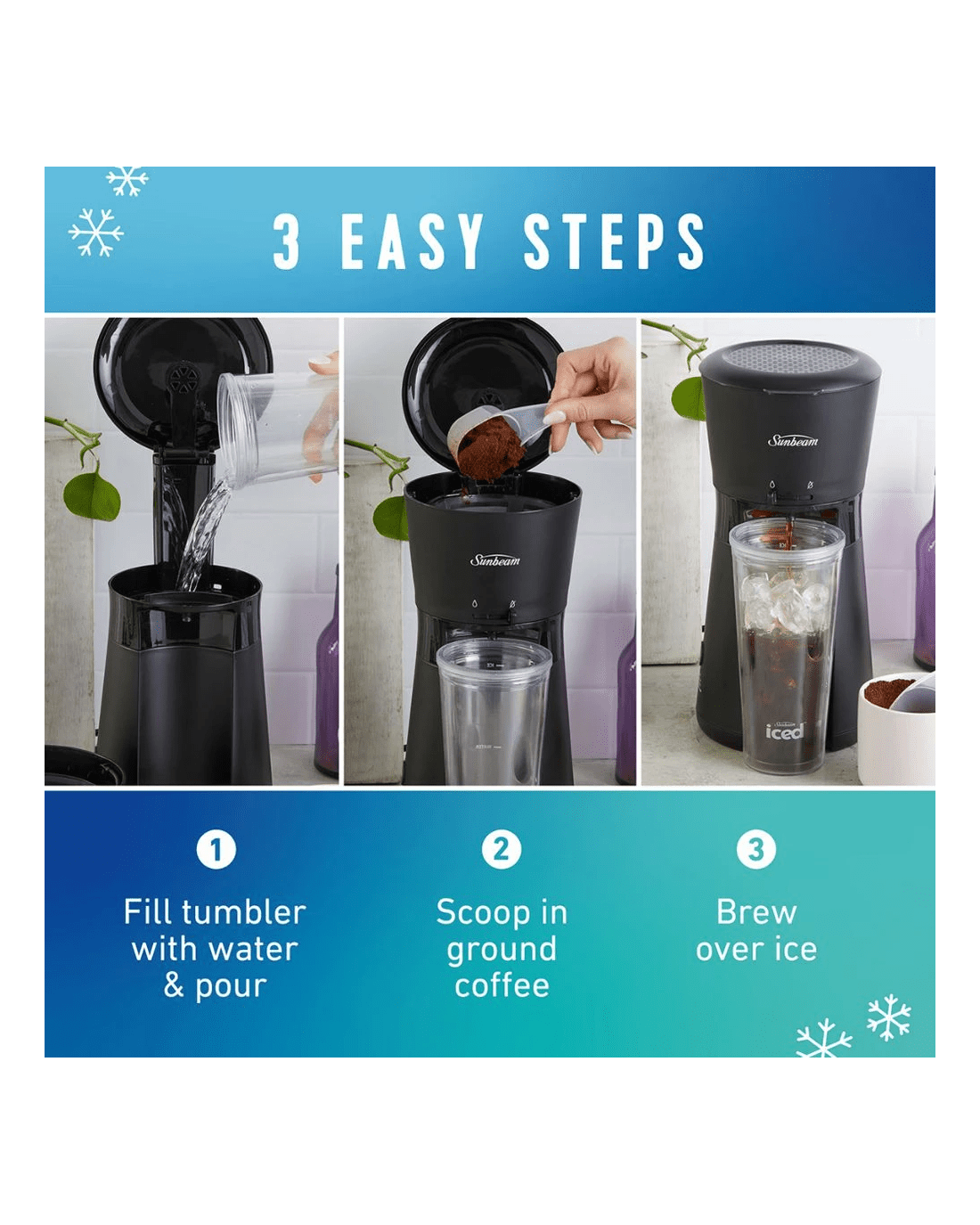 - It operates in three simple steps: fill the machine with water, scoop in your coffee grounds, add ice to the tumbler, and press brew.