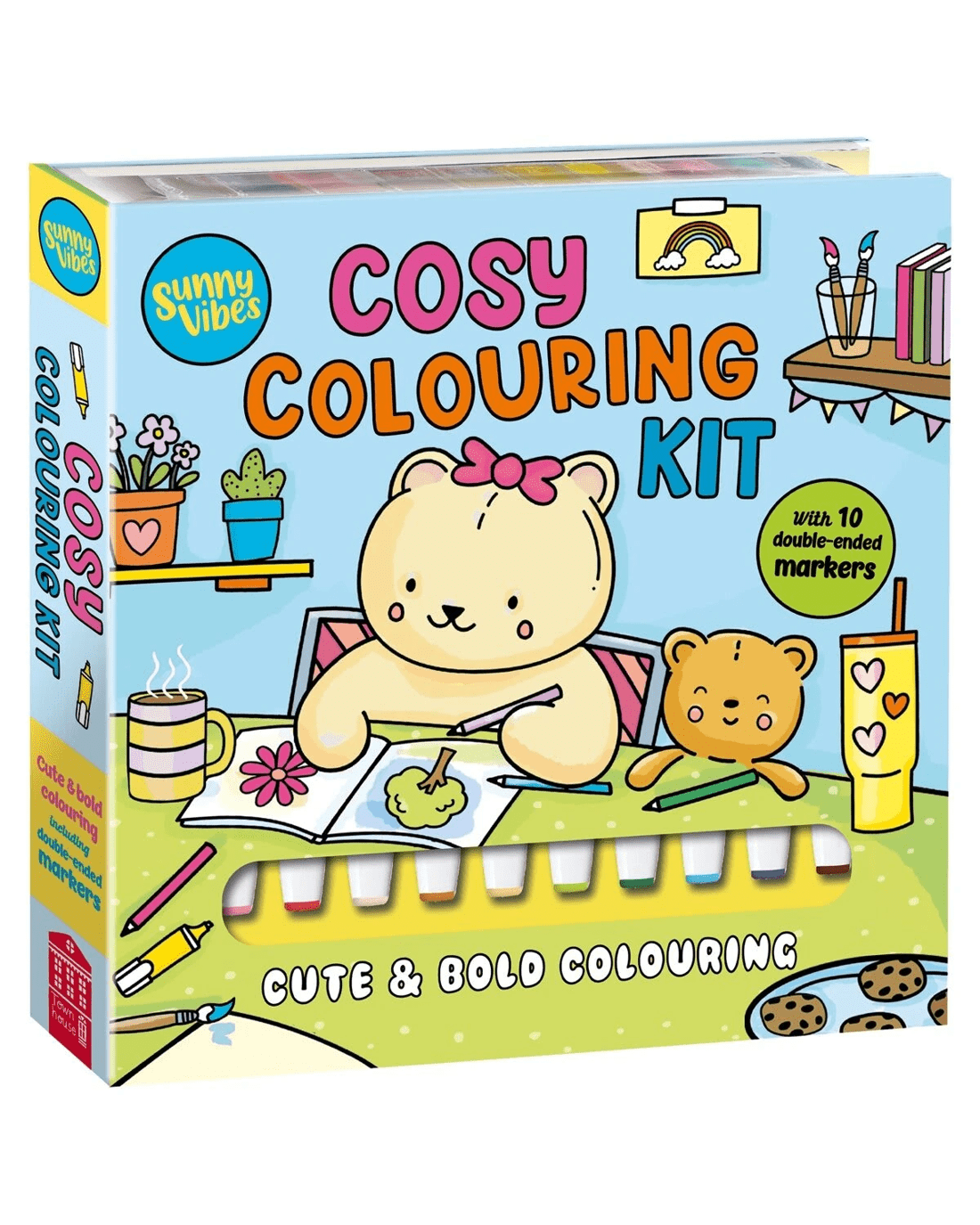 Cute and bold colouring kit with 10 speciality alcohol markers perfect for adding colour, shading and detail. Filled with happy scenes of animal characters enjoying time at home – baking, gardening and snuggling under blankets – this kit is perfect for anyone who wants to create a moment of calm and wellbeing. Join this huge trend of colour as seen on social media and upload to the Sunny Vibes account.