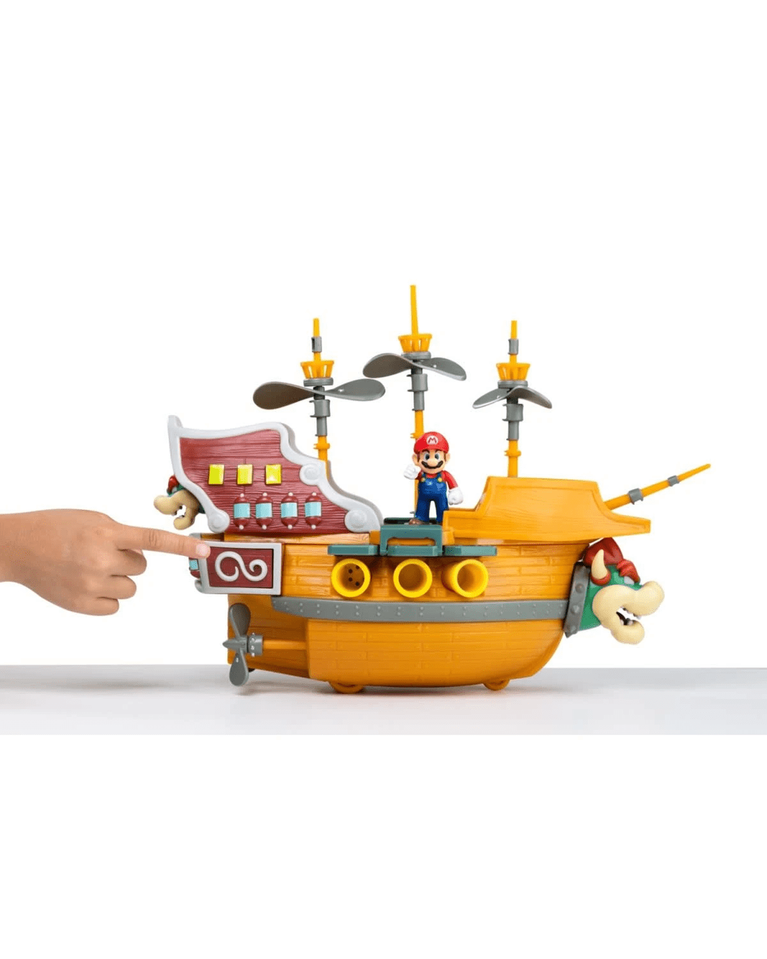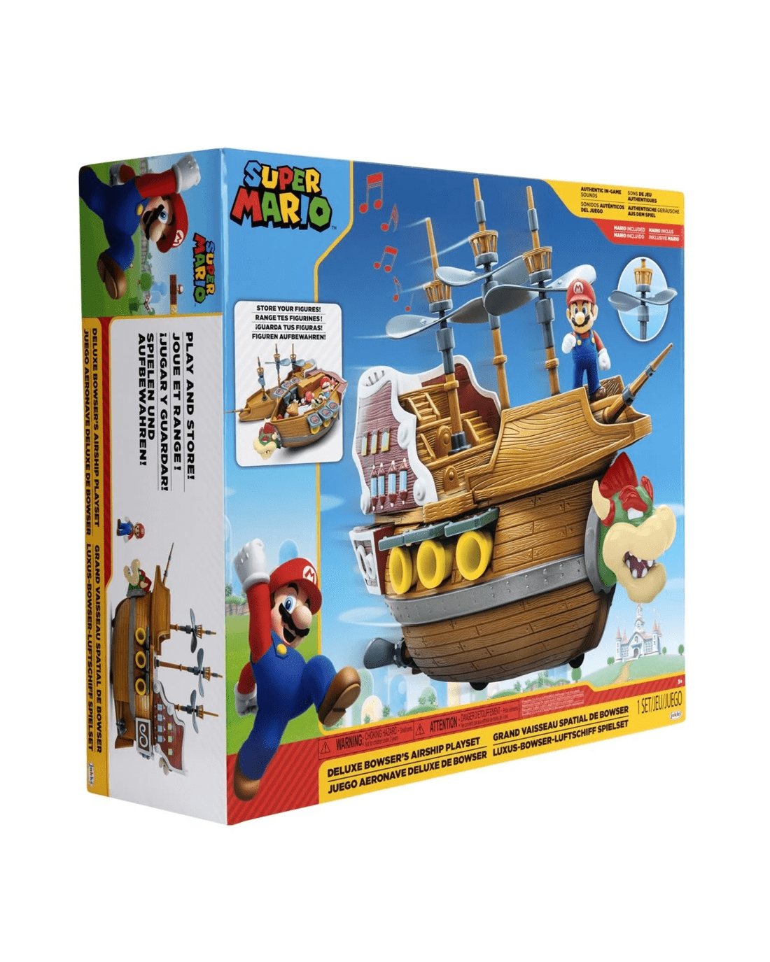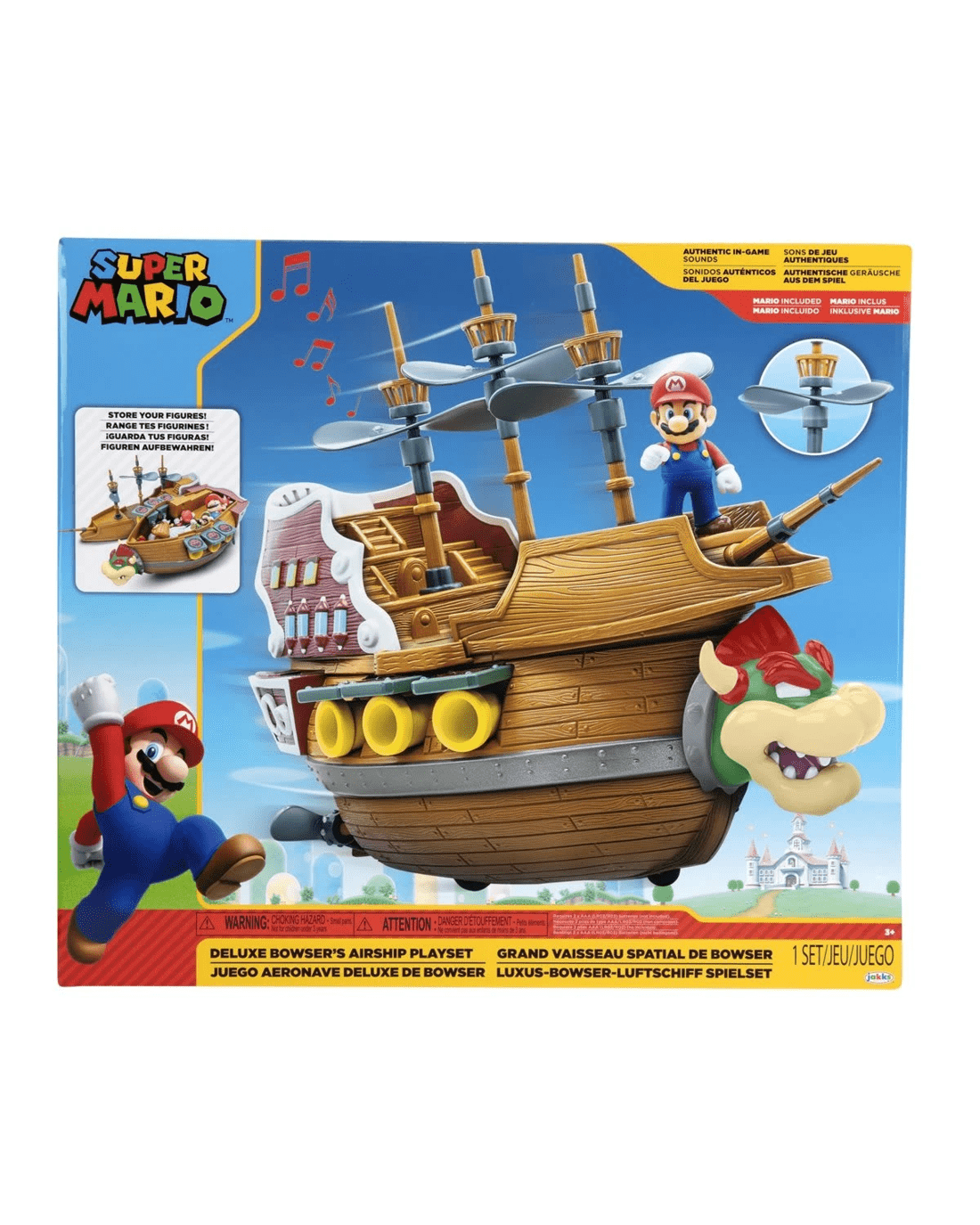The Deluxe Bowser's Airship is a propeller-driven fortress created to bring your Super Mario playset dreams to life. Equipped with cannons, rotating propeller masts, wheels, and authentic in-game sounds, the Airship includes a two-and-a-half-inch Mario figure poised for victory. Roll the airship to activate spinning propellers and open the ship to store all your figures! Press the button to activate in-game sound effects.
