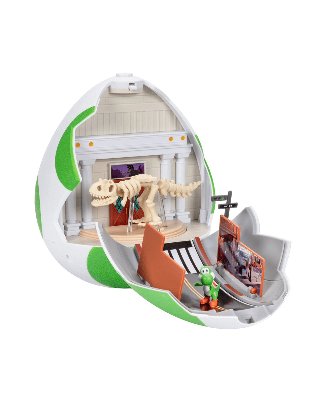 - New York side includes streets of New York museum setting with crumbling dinosaur skeleton and doorway