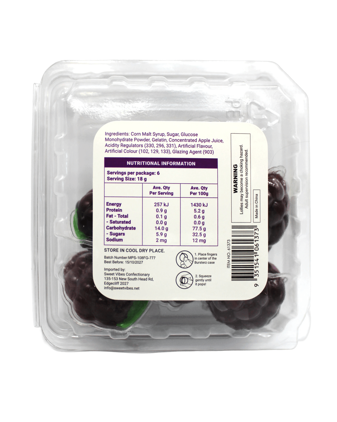 Pop it, bite it, squeeze it! These juicy grapes gummies burst with a fun liquid center in every bite. Gluten-free, playful and perfect for snacking anytime, 108g of pure gummy fun!