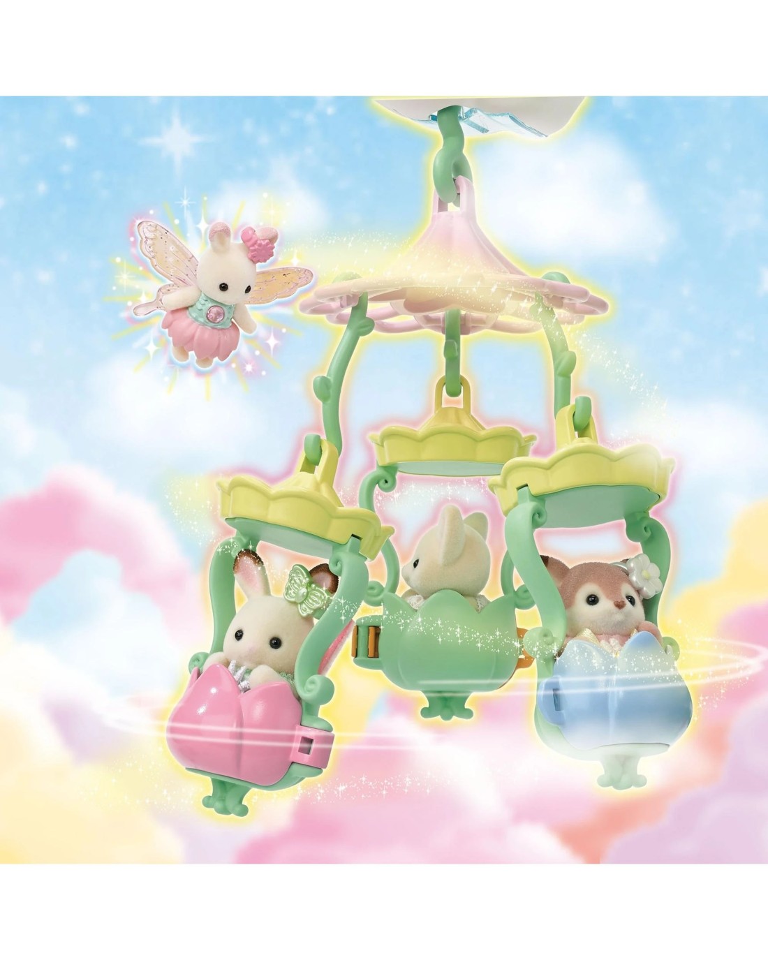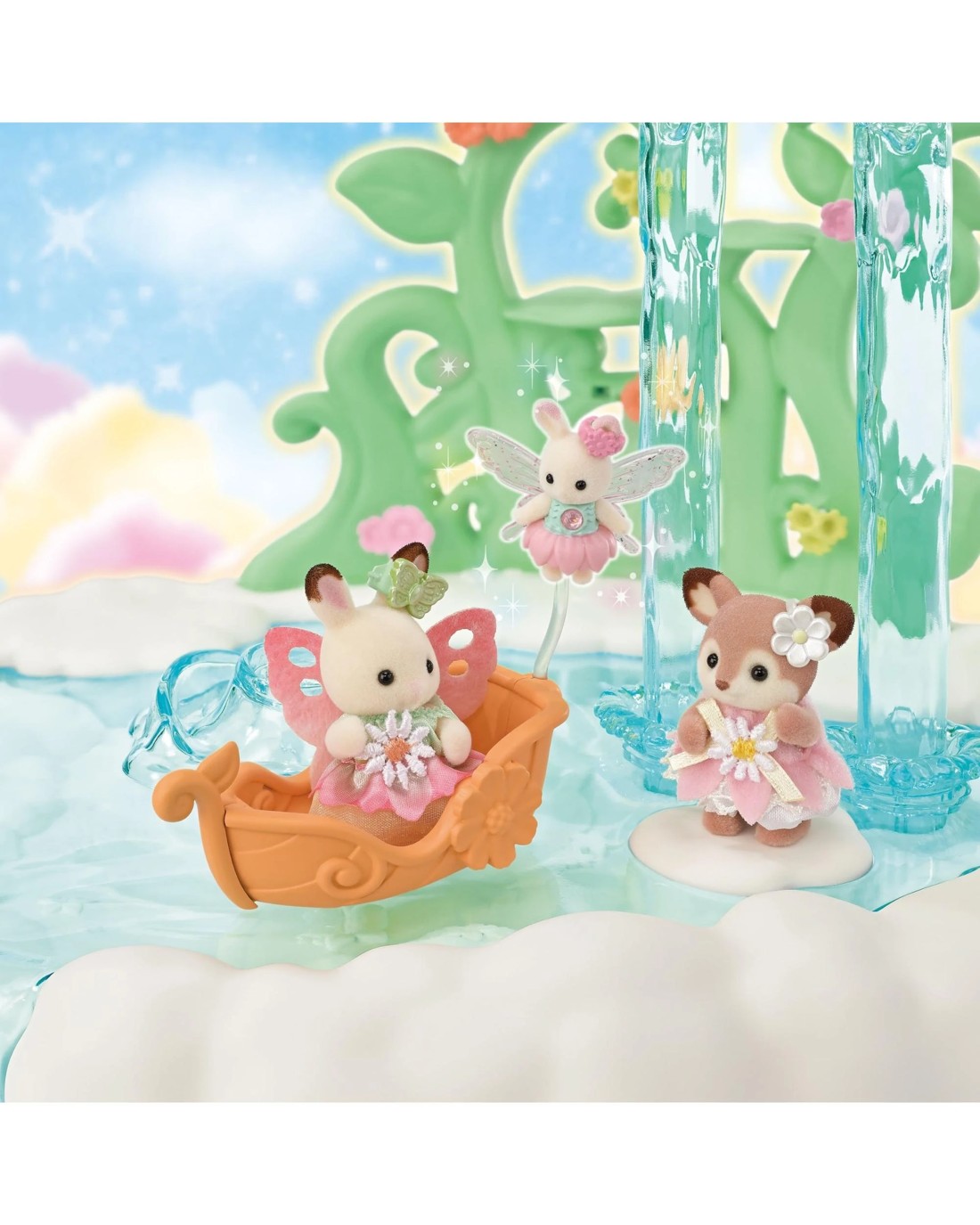 Skytop Fairy Castle is a sky and flower-themed amusement park - Pack Includes a Flower Fairy and Creme, the Chocolate Rabbit baby in a fairy costume. Dressed in removable fabric clothing, these miniature animal figures have articulated arms, legs and head and are made with a high quality fabric giving them a soft velveteen surface. Each figurine has its own story and can be complemented with a range of accessories. This castle includes lots of fun rides, including a Fairy Castle, Flower Sky Ride and Blossom Fountain! Comes with a fairy stand to make the Flower Fairy "fly"! There's a cafe area with a table and chair in the Fairy Castle, and any child figure can sit in the Leaf Boat. The Flower Fairy and Chocolate Rabbit baby are wearing a cute earring. Ages: 3+