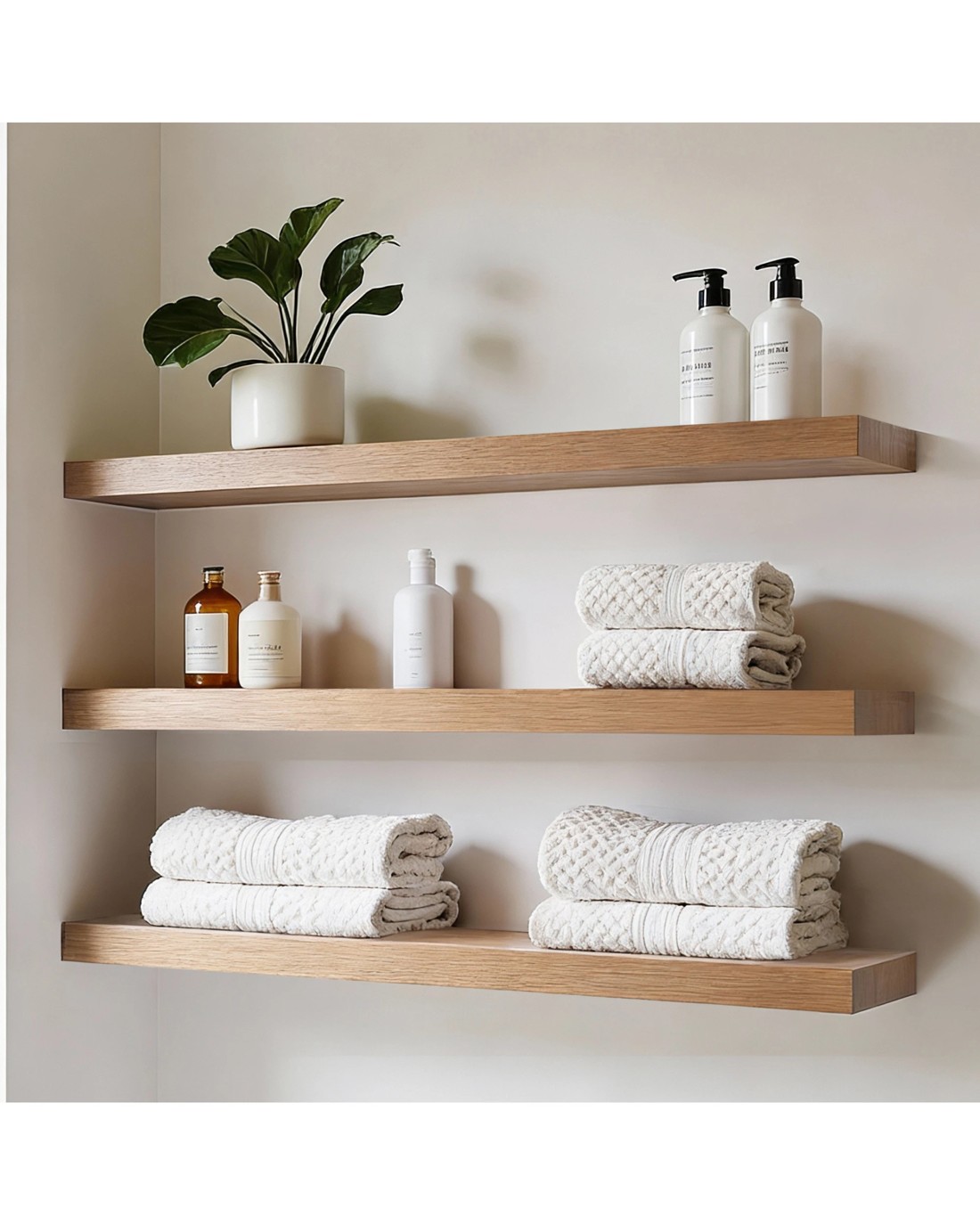 Crafted from durable MDF with a smooth, water-resistant laminate finish, each 90cm shelf is designed for long-lasting use. Easy to install and simple to maintain, the set of three shelves allows you to create customised wall arrangements to suit your lifestyle and space. With a weight capacity of up to 5kg on plasterboard and 10kg on brick walls, they combine reliable strength with timeless style.