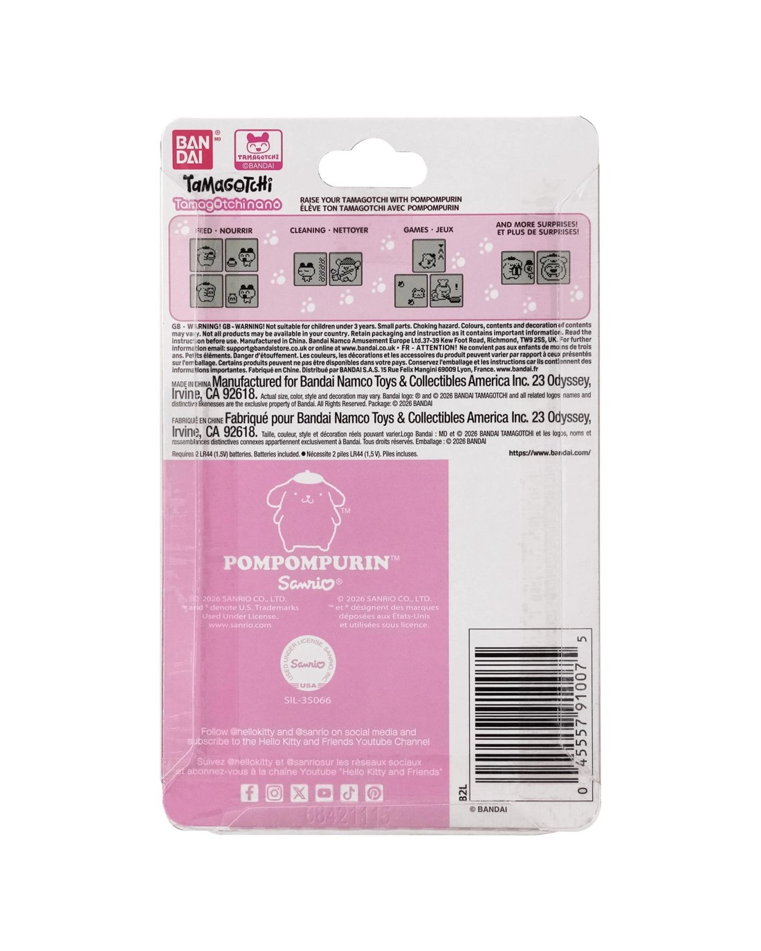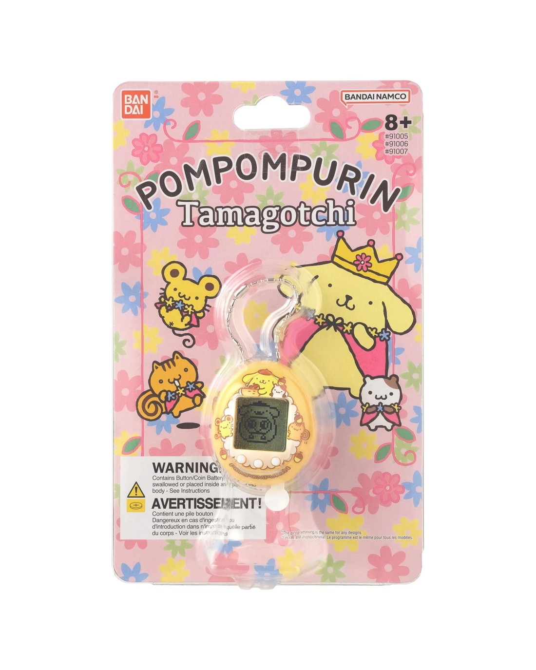 Bring home the cuteness of Sanrio's Pompompurin with the POMPOMPURIN Tamagotchi Nano. Care for your Tamagotchi character alongside Pompompurin as you feed it, clean up, and enjoy daily activities together. How you care for your Tamagotchi character will determine how it grows and which adult character it becomes. Good care may be rewarded with a special present from Pompompurin. The device includes three charming mini-games: DANCING♪, ACORN PICKING, and COOKING. Unlock special animations when you master each game, bringing extra magic to every play session. Ages 8 +
