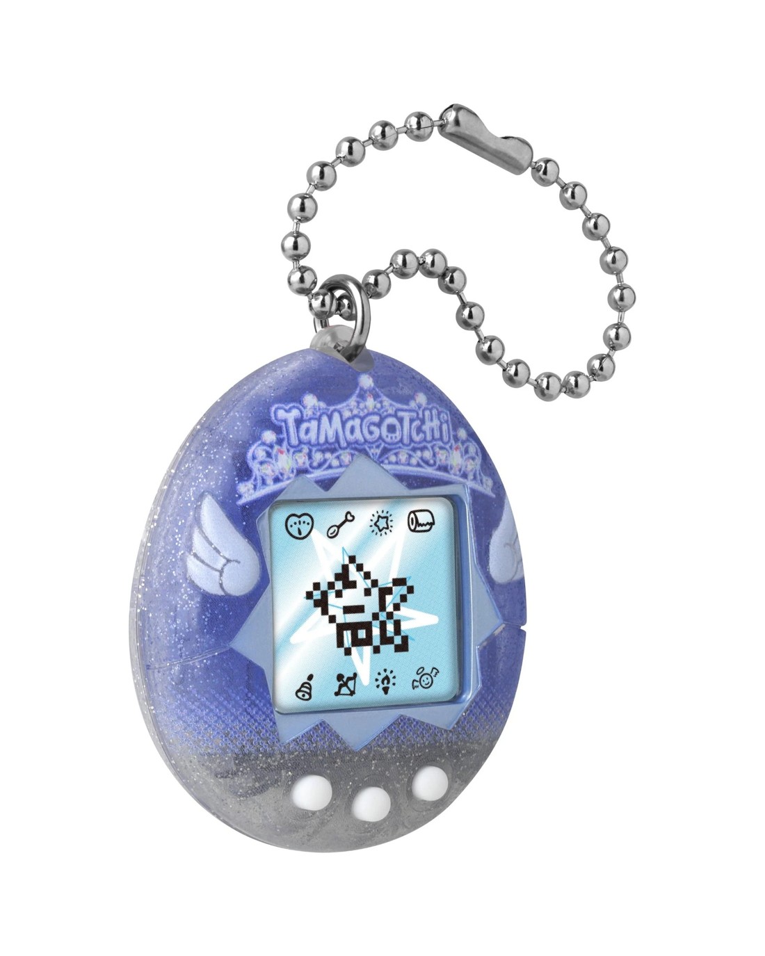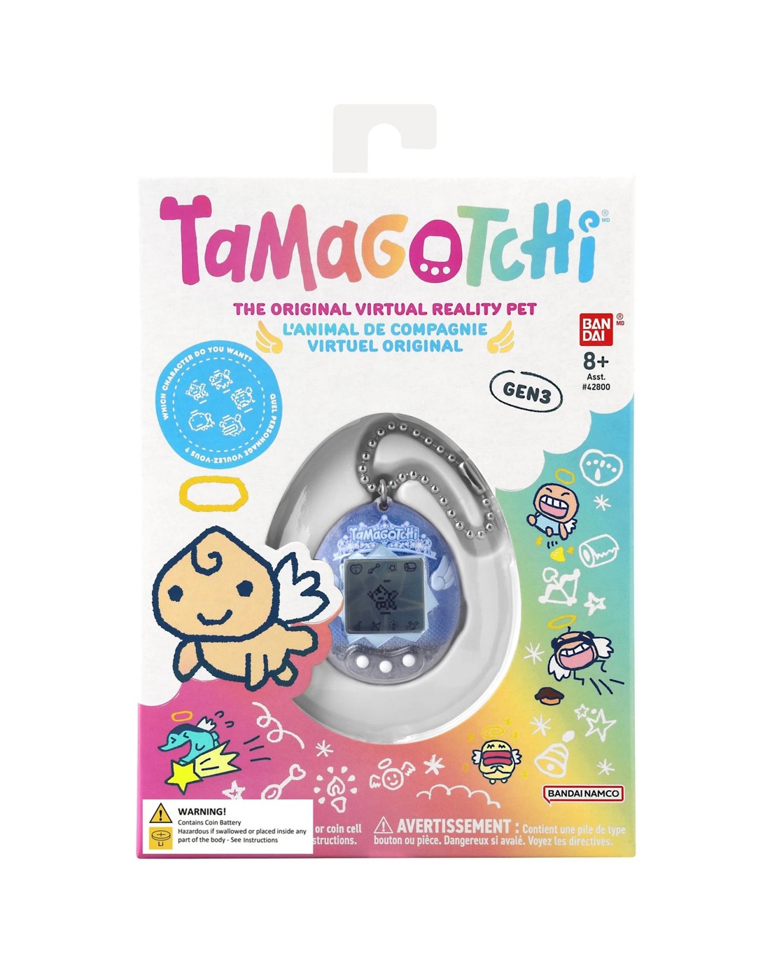 The Original digital pet you love with a Angel shell design and three-dimensional wings! Comes with the Angel programming, the device will begin with the Obaketchi Angel (a ghost character) and depending on how you nurture your character will determine which of the 5 adult Tamagotchi Angel characters you will get. You feed it, clean up after it, and even praise it. Plus, you can play the Shooting Star mini game! Includes the CR2032 battery and attaches to your bag so it goes everywhere! Ages: 8 +