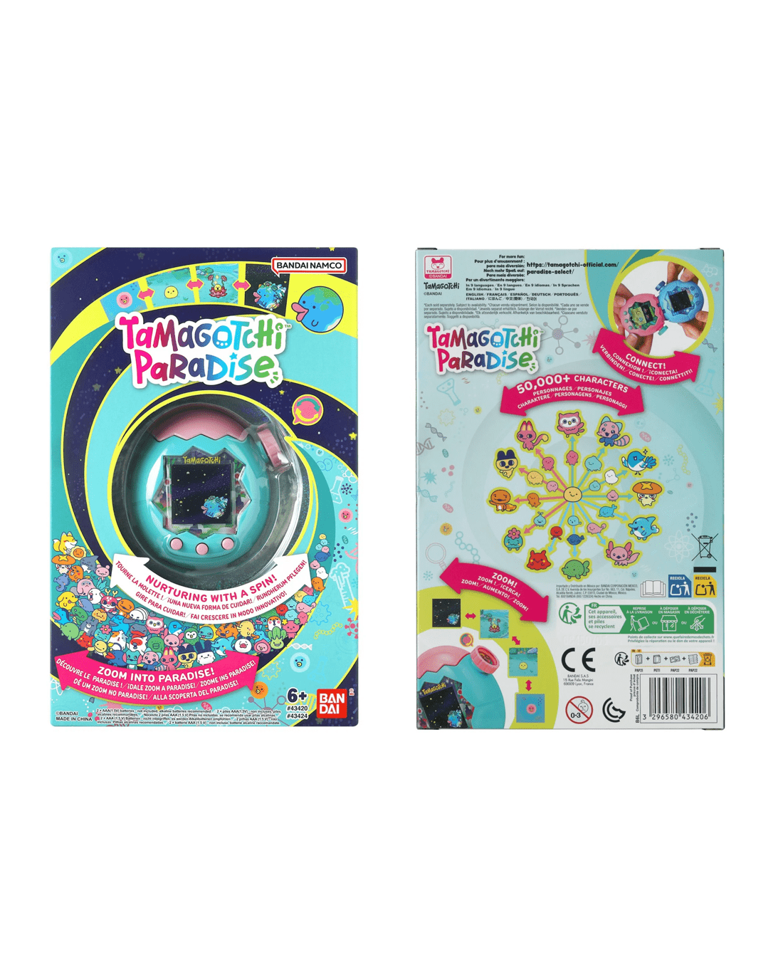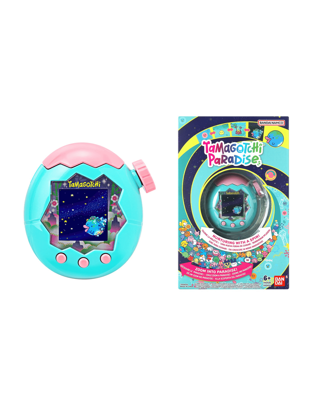 Nurture with a spin! Zoom into Paradise! Turn the dial to take care of your Tamagotchi character. Zoom from cell to space for traditional nurturing play - clean the poop, feed them delicious food and make them feel better! Play mini games and nurturing activities and shop in the Lab mode!