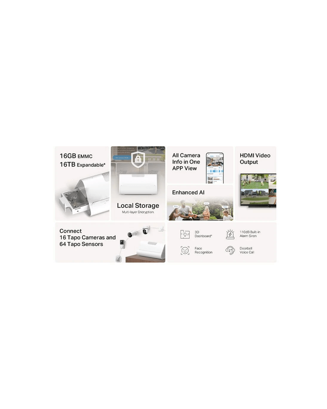 • Smart Home Ecosystem Centre: Capable of connecting up to 16 cameras and 64 sensors to build your smart home ecosystem.