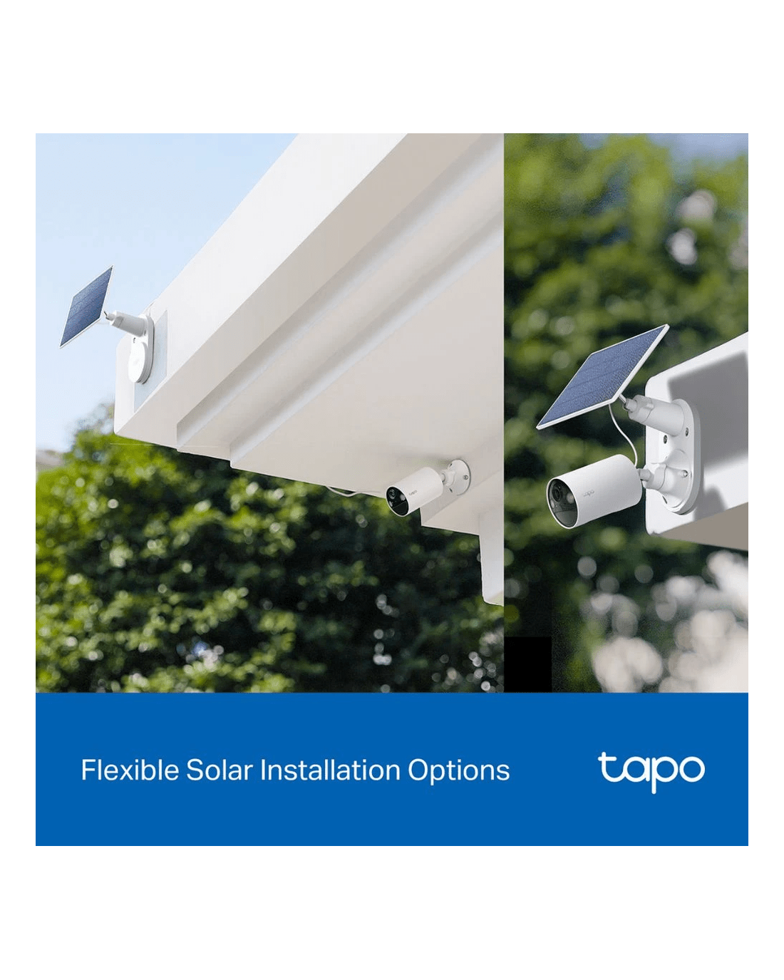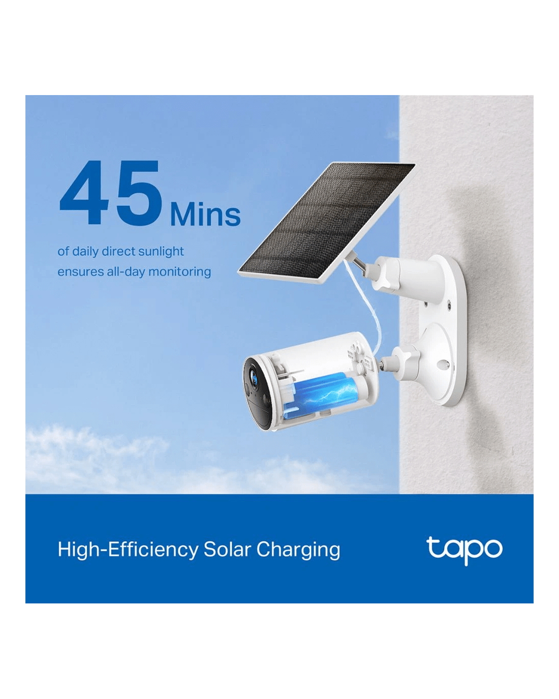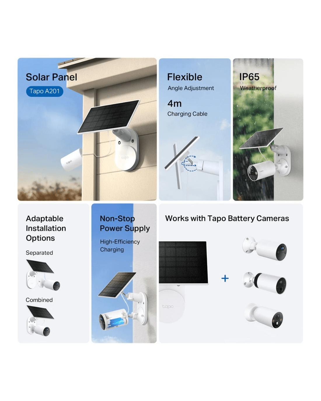 This Tapo A201 Solar Panel seamlessly pairs with all Tapo Battery Cameras. It offers a sleek, unified look and flexible positioning with a 4m charging cable for maximum sunlight exposure.