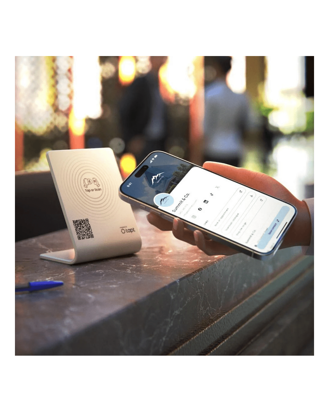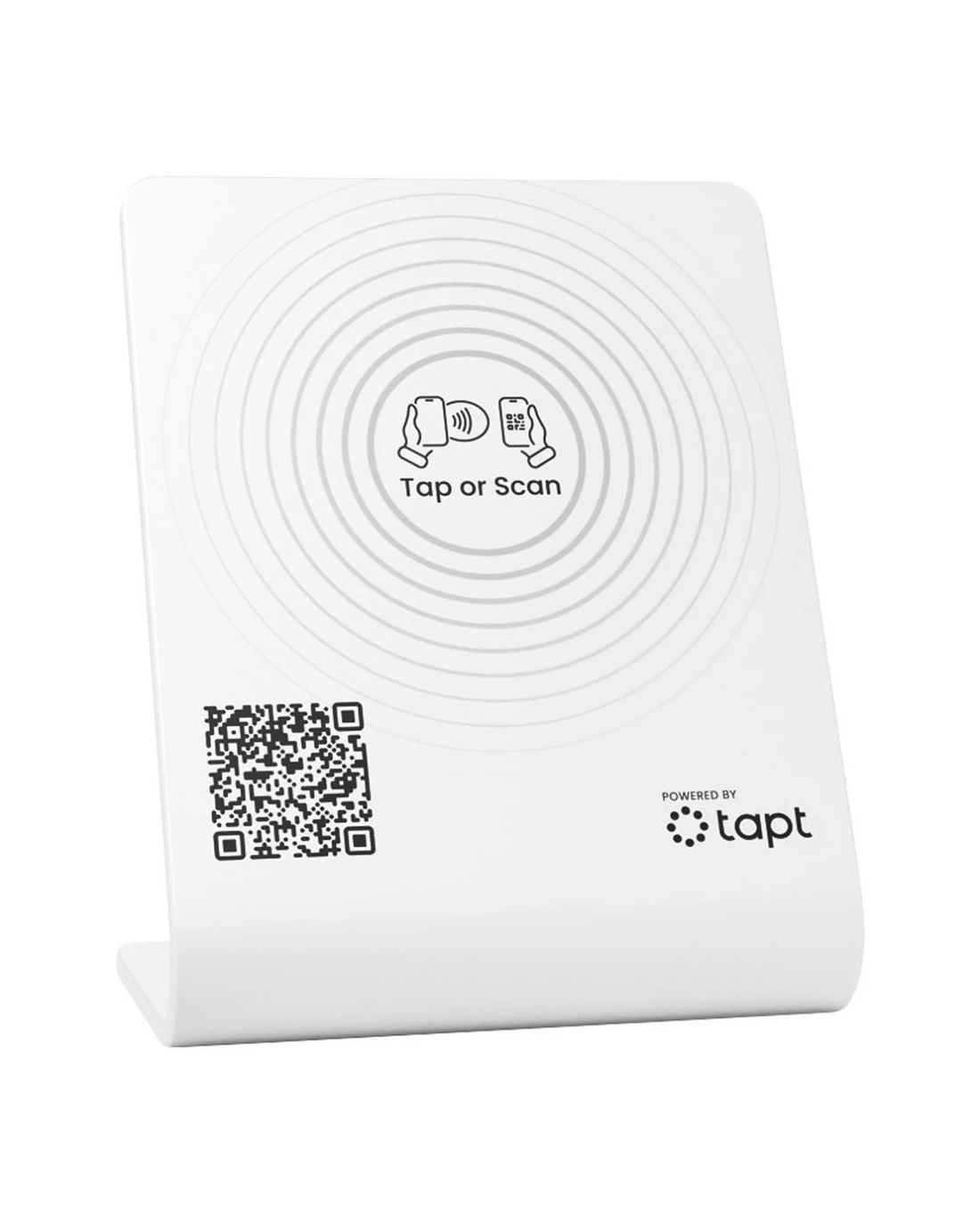This Tapt NFC Stand can be placed at reception desks and events to share business information with just a quick tap or scan. It lets you connect with clients or customers by sharing your contact details when they hold their smartphone or mobile device to the stand. It features an easy to customise digital profile that will leave a lasting impression and elevate the customer experience.