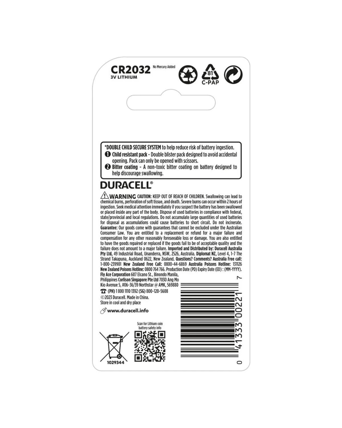 Warning: Button Cell Batteries are Hazardous (new or used). Keep away from Children. Button Cell Batteries can cause severe or fatal injuries in 2 hours or less if they are swallowed or placed inside any part of the body. If you suspect your child has swallowed or inserted a button cell battery, call the 24-hour Poisons Information Centre in Australia on 131126 or in New Zealand on 0800 764 766 or contact your country's emergency department.