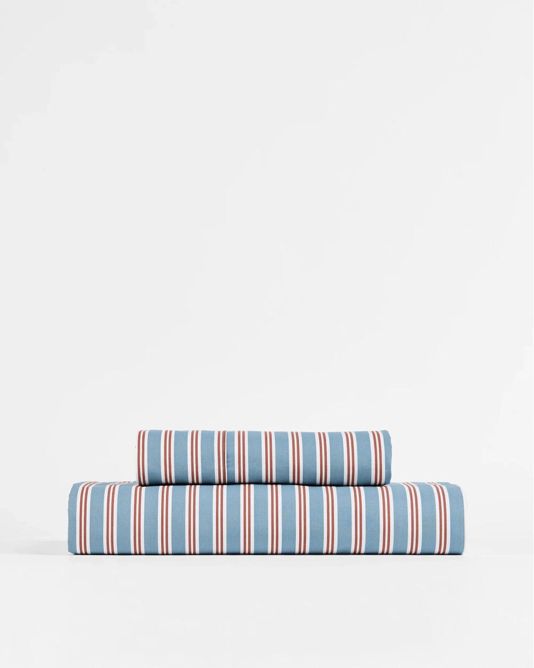 Brighten up your bedroom with the Elio Stripe Australian Cotton Fitted Sheet Set. Featuring a charming Elio Stripe print in a calming bluestone hue, this set offers a fresh look for your bed. Perfect for anyone wanting a cosy and inviting space, it combines soft Australian cotton with practical design for everyday comfort. Ideal for those who value quality and easy care, this sheet set is your go-to choice for a relaxed night's sleep.Features