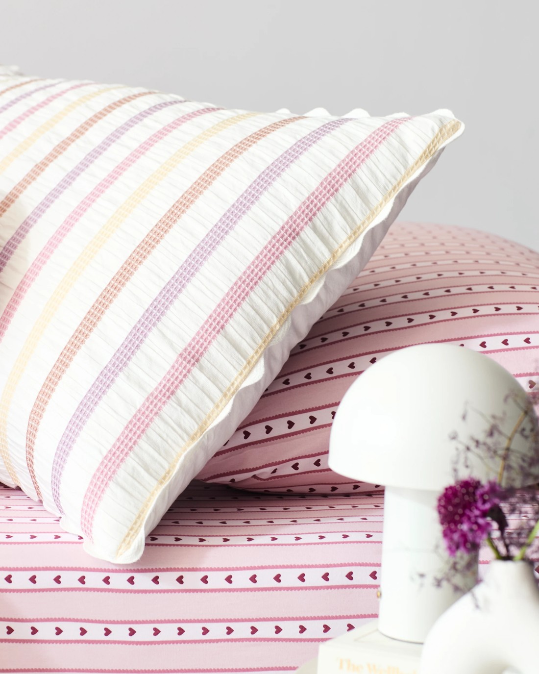 Transform your kid's bedroom with the Frankie Waffle Stripe Seersucker Quilt Cover Set. Made from 100 percent cotton, it provides cosy softness and breathable comfort, making it perfect for year-round use. The attractive stripe front and textured seersucker finish add a cheerful, stylish flair to your bedding. This set is also designed to be machine washable, helping you keep it looking fresh with hardly any effort. Matching pillowcases ensure a harmonious look for your bed, while the versatile design lets you easily pair it with other bedding styles. Bring a delightful boost to your kid's bedroom space and let them enjoy smooth, snug nights—try this quilt cover set for a truly inviting touch.