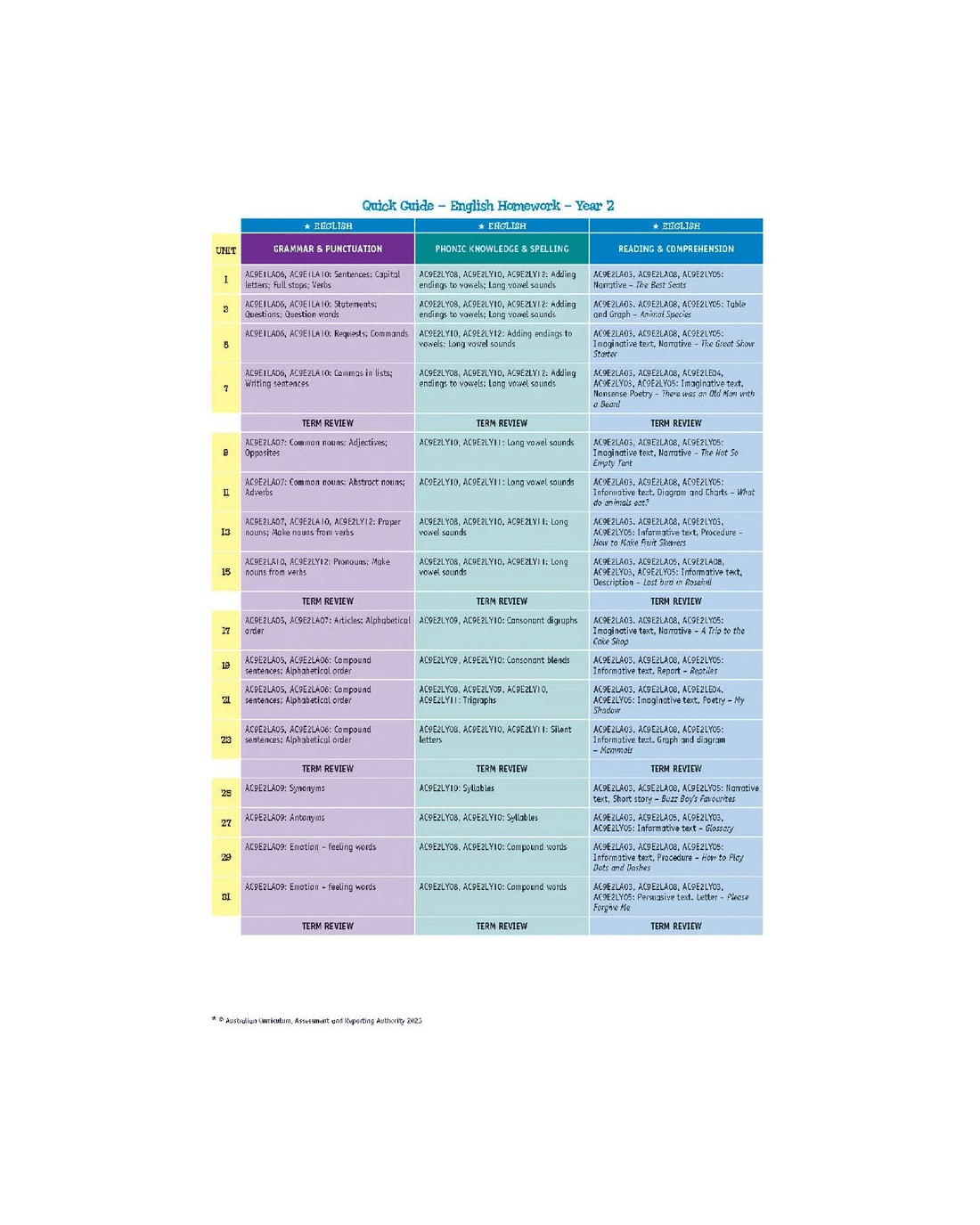 - Each book contains 32 weekly units (8 per term) with activities in, Grammar & Punctuation, Phonic Knowledge and Spelling, Comprehension and Reading, Number and Algebra, Statistics and Probability, Measurement and Geometry and Problem Solving.