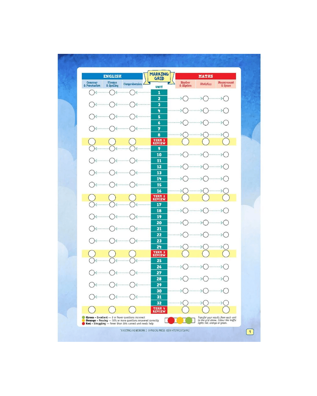 - It includes a Traffic Light marking system — a simple colour-coded marking system enables children to record their results and provides parents and teachers with an at-a-glance overview of their progress.