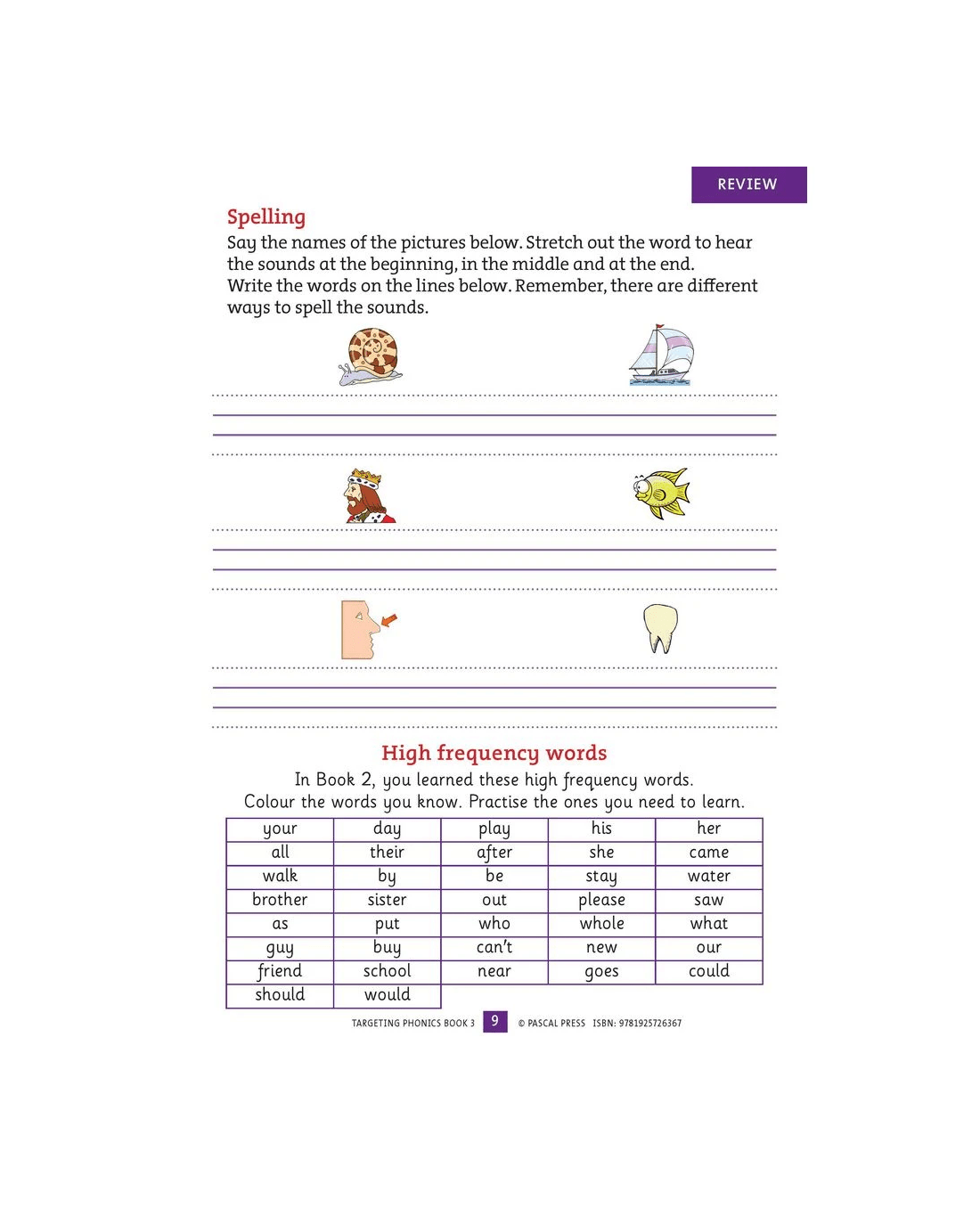 - Review pages follow each unit with activities covering comprehension, spelling, and high frequency words.