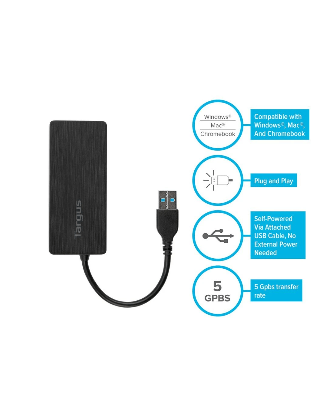 The Targus 4 Port USB 3.0 Hub can be used to turn 1 USB port into 4 by simply plugging the hub into one of your computer's USB 3.0 ports. It will help to create a smooth connection and provides high speed data transfer rates of up to 5 Gbps. Its unique micro design makes it a must have for those traveling and who need to connect multiple devices at once.