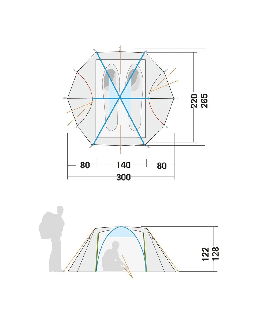 The outer tent provides effective protection against wind and weather, while the two spacious vestibules offer ample storage space for backpacks, food, and accessories. The side entrances facilitate easy access, and the vestibules help keep the inner sleeping area free for rest. Inside, two large windows with mosquito nets ensure good airflow and insect protection, enhancing comfort during your outdoor adventures. The PU-coated material guarantees that no water penetrates the tent, keeping you dry in wet conditions.