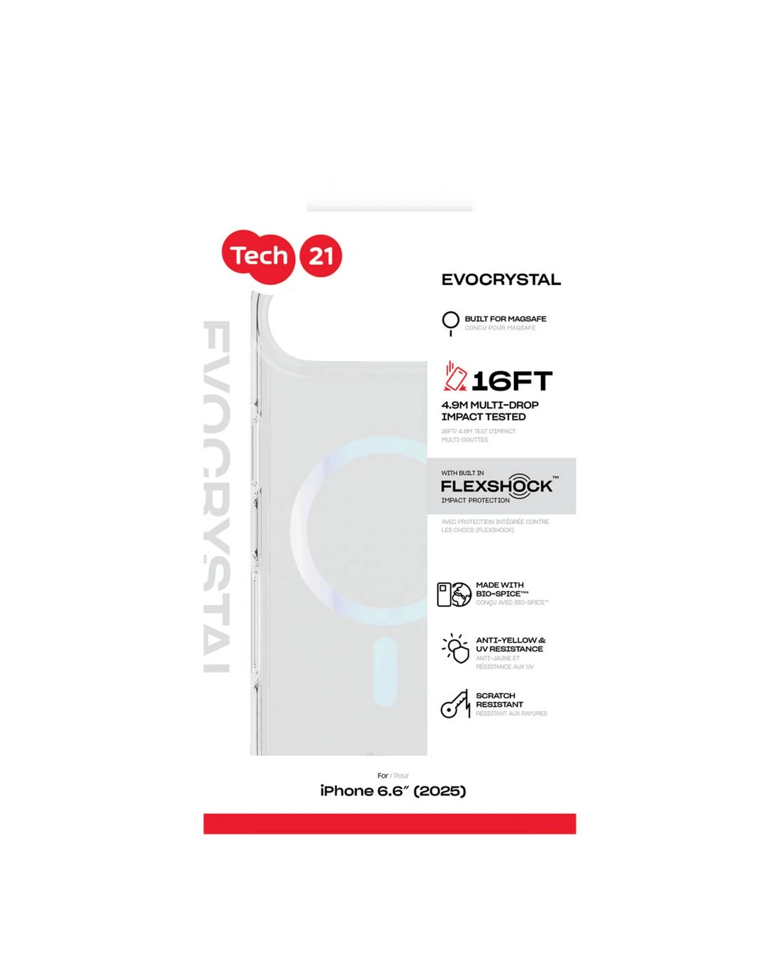 This EvoCrystal case with MagSafe is designed to showcase your iPhone while delivering powerful protection. It’s made with a bio-spice material and offers 16FT/4.9M FlexShock impact resistance, tested to be 15 times stronger than military standards. Plus, built-in UV-resistant agents help maintain long-term clarity so your device stays looking fresh.