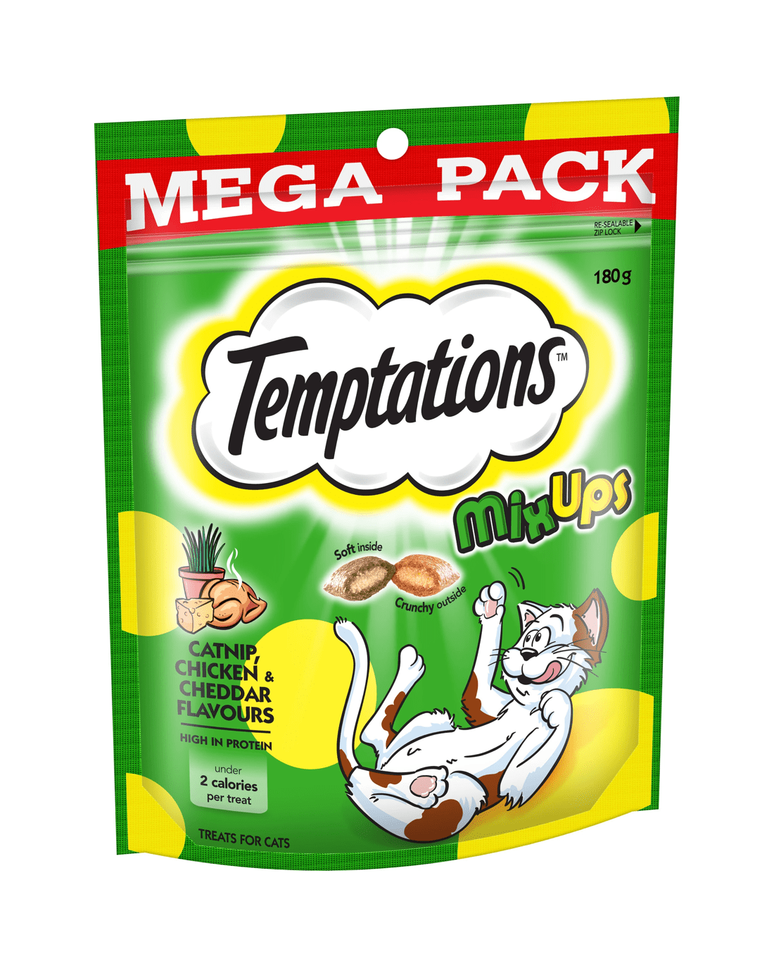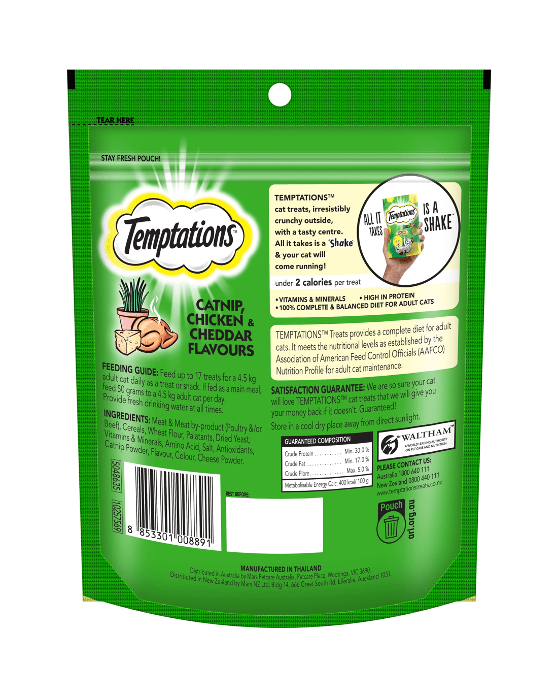 Temptations cat treats are the great-tasting treats cats can't resist. Crunchy on the outside and soft on the inside. All it takes is a shake and your cat will come running. They come in a handy resealable pack for freshness and in a variety of delicious flavours that your cat will adore! Nutritionally balanced, you can feed up to seventeen treats for a 4.5kg adult cat daily as a treat or snack. If fed as a main meal, feed 50g to a 4.5kg adult cat per day.