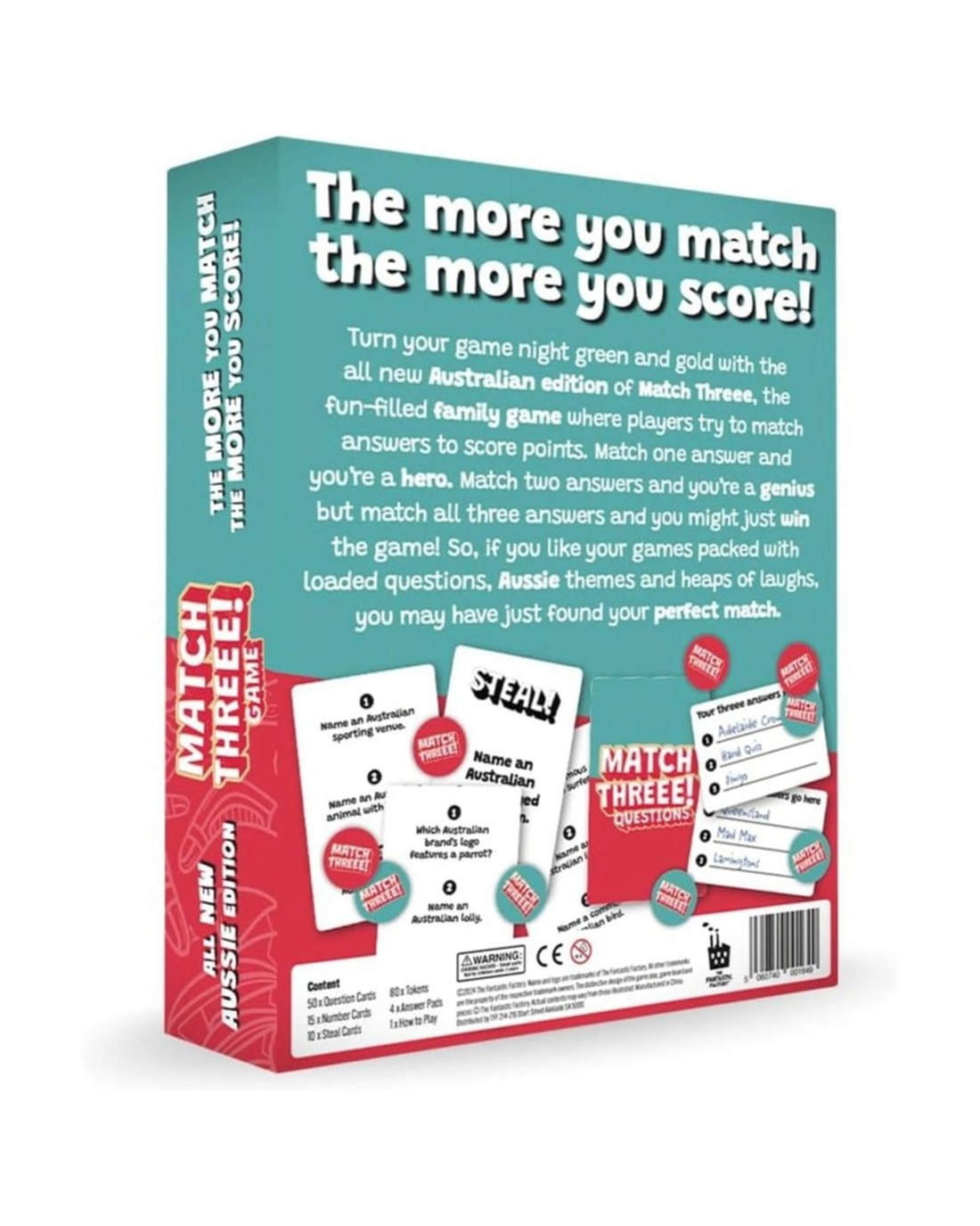 A Game for Aussies, designed by Aussies full of Aussie questions, perfect for an australian game night or family gatheringTurn your game night Green and Gold. 100% Australian contentThe fun filled family game with light strategy, think like you opponentWhich friend or family member knows the most about Australia?The More your answers Match the More You ScoreItem Specifics