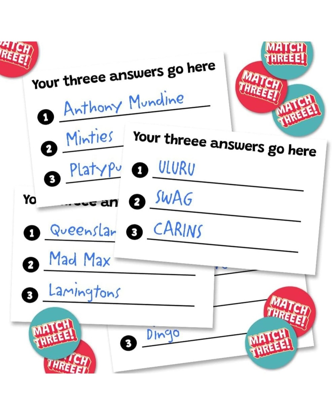 Match Three is the perfect game for game night whether you are playing with family, friends or both. This game is packed full of Aussie questions. All you have to do is match the answers with your opponent to score big. The winner will be declared a true Aussie and will have bragging rights for the rest of their lives. Ages: 8 + | Players: 2 - 6