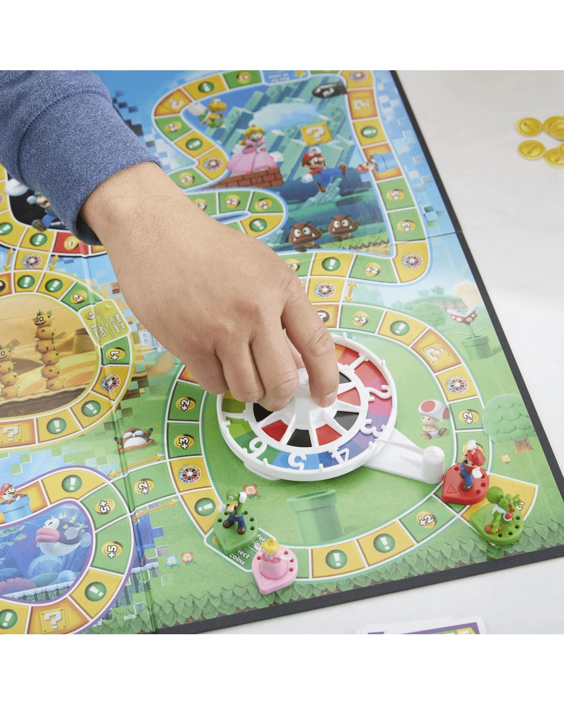 In The Game of Life: Super Mario Edition board game, players choose to play as Mario, Luigi, Peach, or Yoshi, journeying through the Mushroom Kingdom, and finally spinning to win in a battle against Bowser! They move around the looping paths of the gameboard as they collect coins, power up with items and Companions, and play fun minigames along the way such as Rock Paper Scissors, Thumb Wars, and Spin-Offs. As they approach Bowser's Castle, players will also buy stars to boost their battle-spin; each star collected adds 1 point to their spin total, and players will need to spin higher than a 12 to defeat Bowser and win the game. This fun game for kids and families is for 2-4 players, ages 8 and up. TM and Copyright 2021 Nintendo. Hasbro Gaming and all related trademarks and logos are trademarks of Hasbro, Inc. Ages: 8 + | Players: 2 - 4